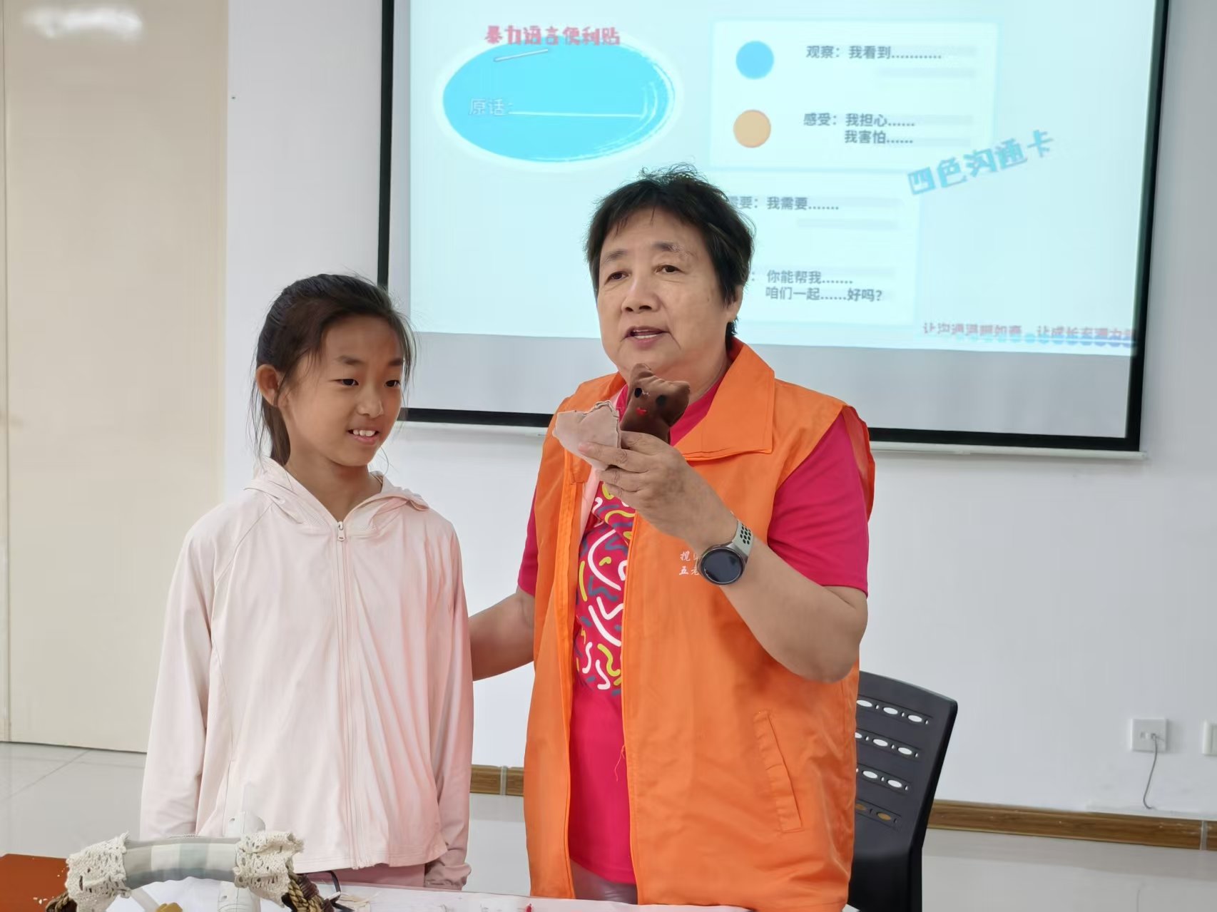 与此同时,五老宣讲员和巡查员化身“暴力语言”记录者,穿梭于亲子之间,悄悄记下沟通中出现的否定、指责等负面话语。“你画得太乱了,重新画!”“缝这个颜色肯定不好看!”……这些不经意的话语被一一收录,成为后续沟通课堂的鲜活案例。