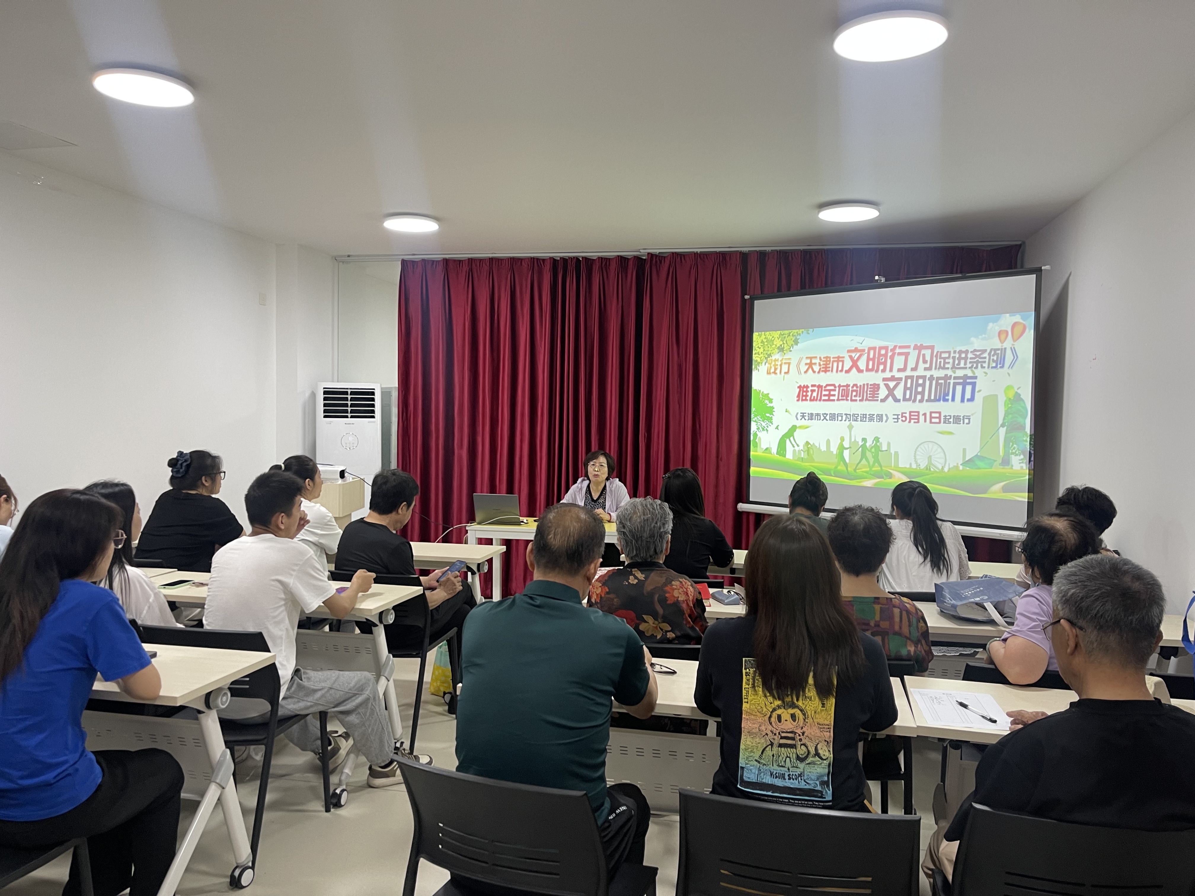 活动伊始,社区邀请新北街道三级调研员张学梅为居民深入解读《天津市文明条例》。讲座围绕公共秩序、环境卫生、邻里相处等与日常生活密切相关的条款,结合典型案例,生动讲解了文明行为规范及法律责任,呼吁居民从身边小事做起,自觉践行文明公约。