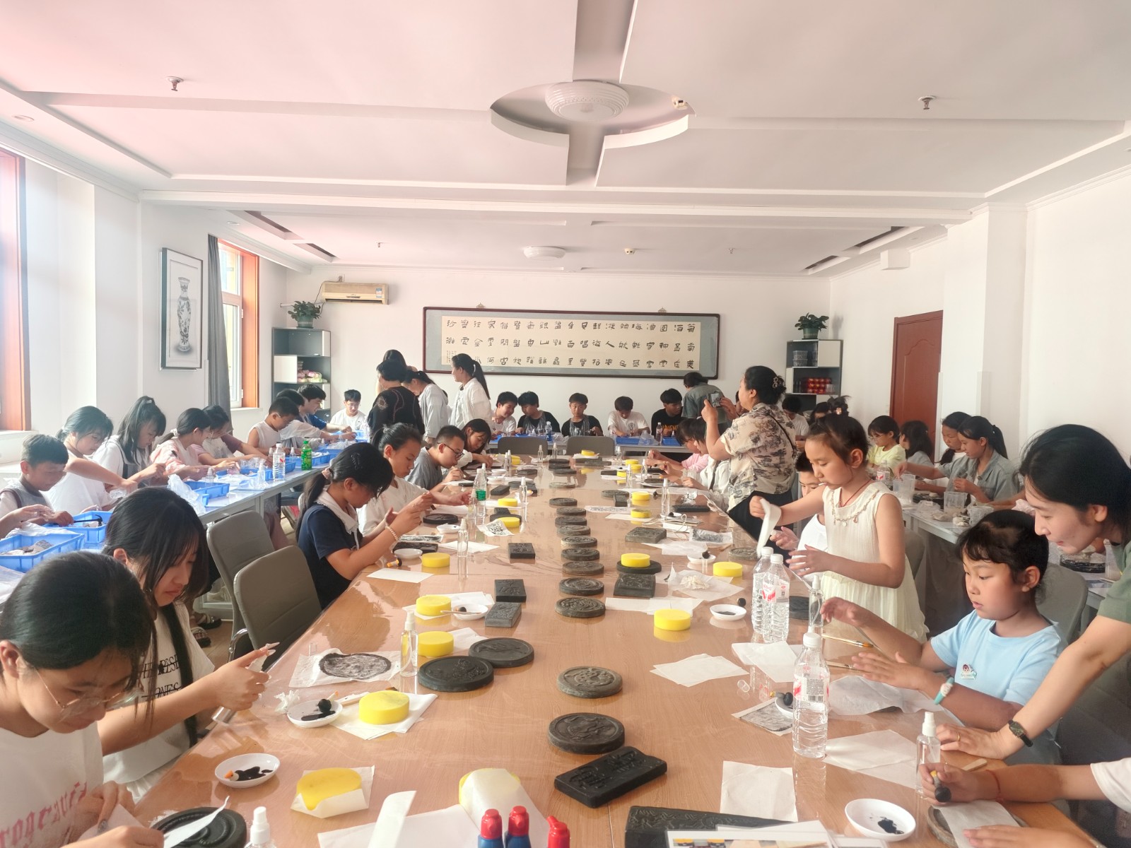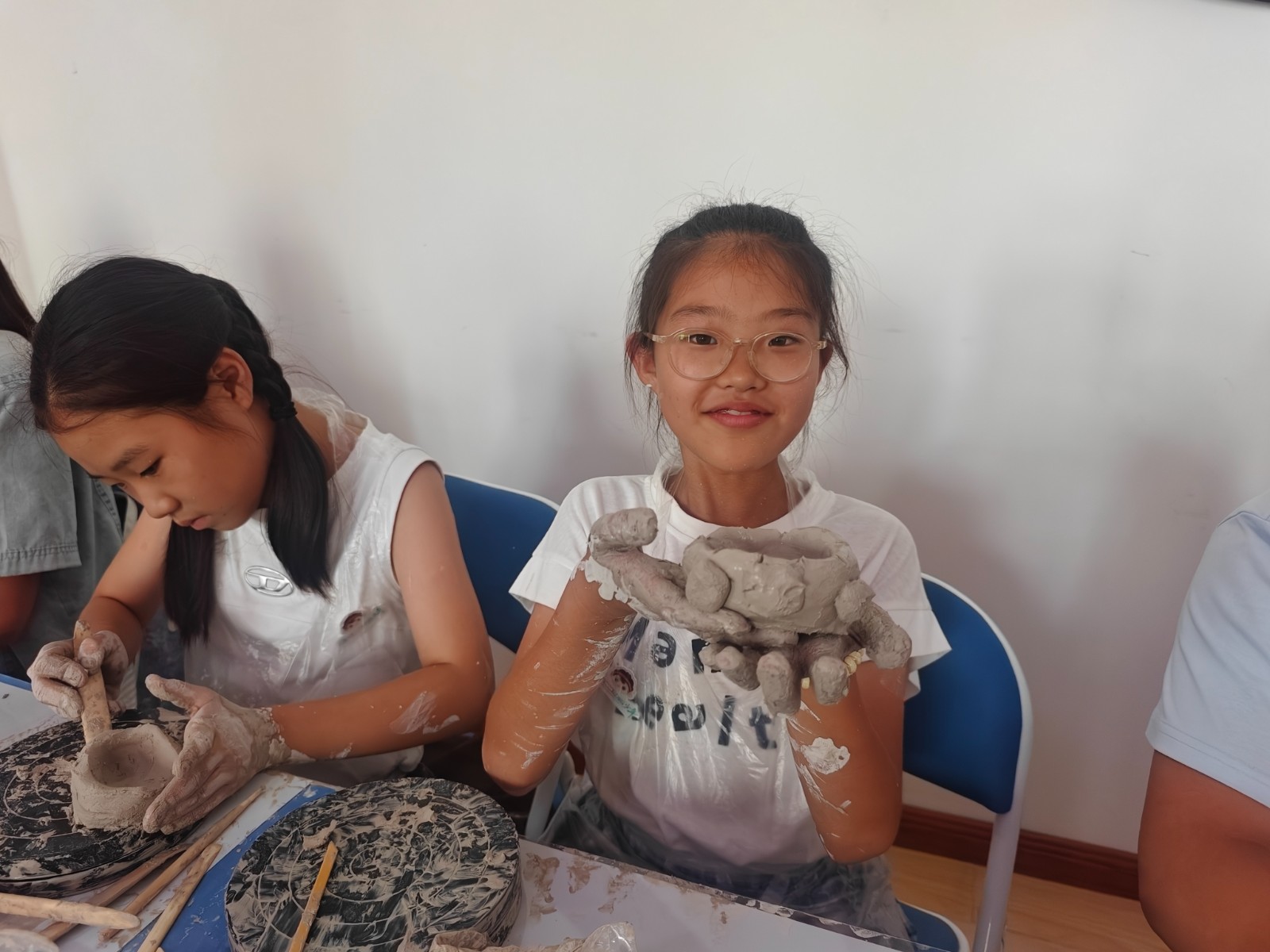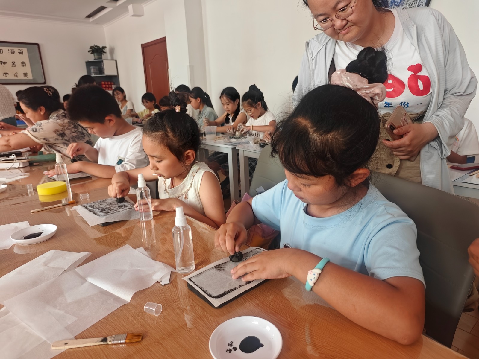 参观环节的高潮当属精心设计的创意手作体验。在“古法拓印”活动中,孩子们用宣纸和墨汁,将馆藏陶瓷珍品上的纹饰拓印下来,感受传统复制技艺的魅力。在“巧手塑陶”活动中,孩子们跟随陶艺师傅进行拉坯、捏塑,成功捏出了自己喜欢的形状。在“陶瓷宝藏”活动中,孩子们手持安全小锤敲击石膏块,伴随着“叮叮当当”敲击声,精美的文创产品、益智小玩具开始显现,成为了开营首日最珍贵的纪念品。