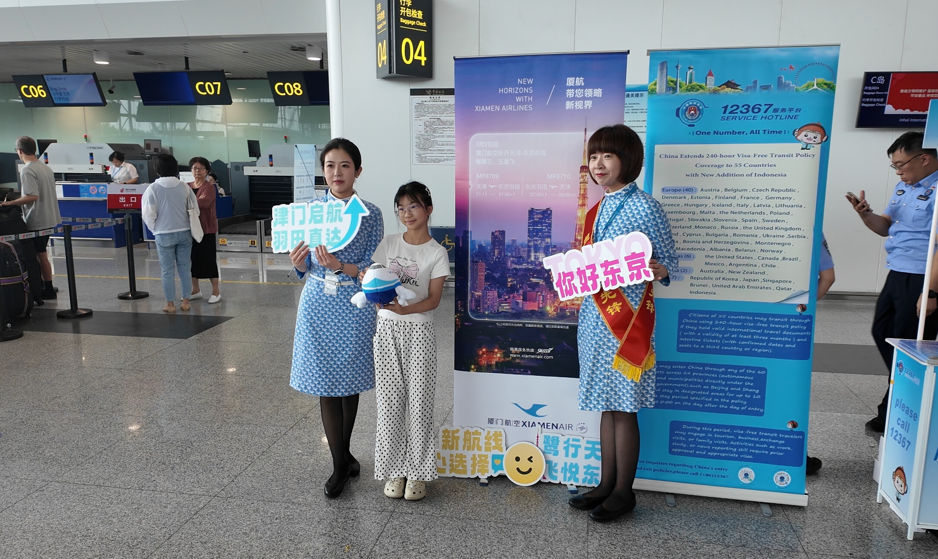 津滨网讯(记者 魏薇 贾磊 通讯员 陈天睿)7月2日晚,天津滨海机场T1航站楼的显示屏上,首次打上了MF8709的航班信息,标志着厦门航空天津—东京羽田国际客运航线正式开通。天津机场边检站精心组织、周密部署,以高标准、严要求确保首航航班安全顺畅通关。该航线的开通,不仅为京津冀地区与东京都市圈搭建起一条高效便捷的空中桥梁,也为深化中日开放交流注入了新动力。