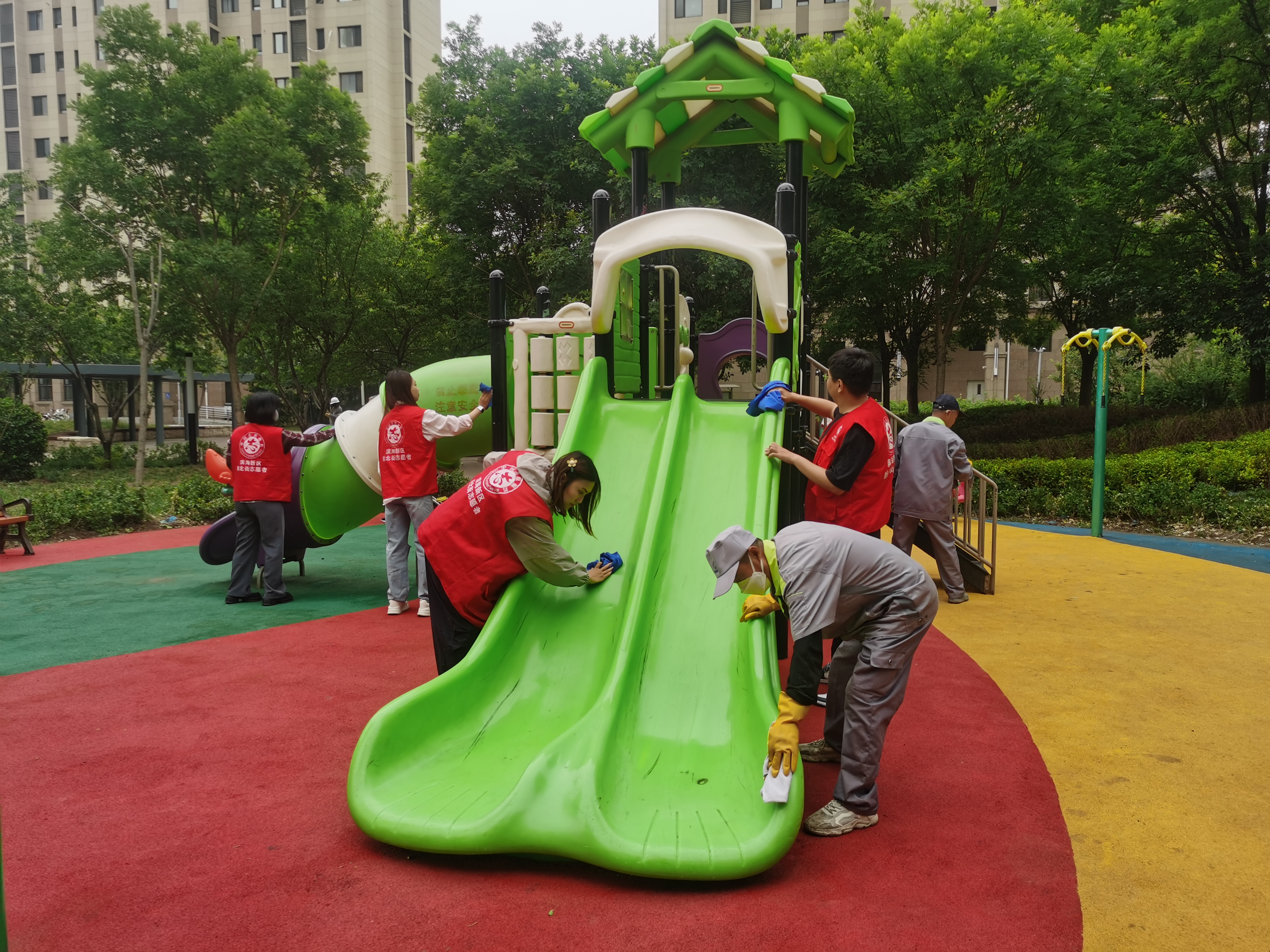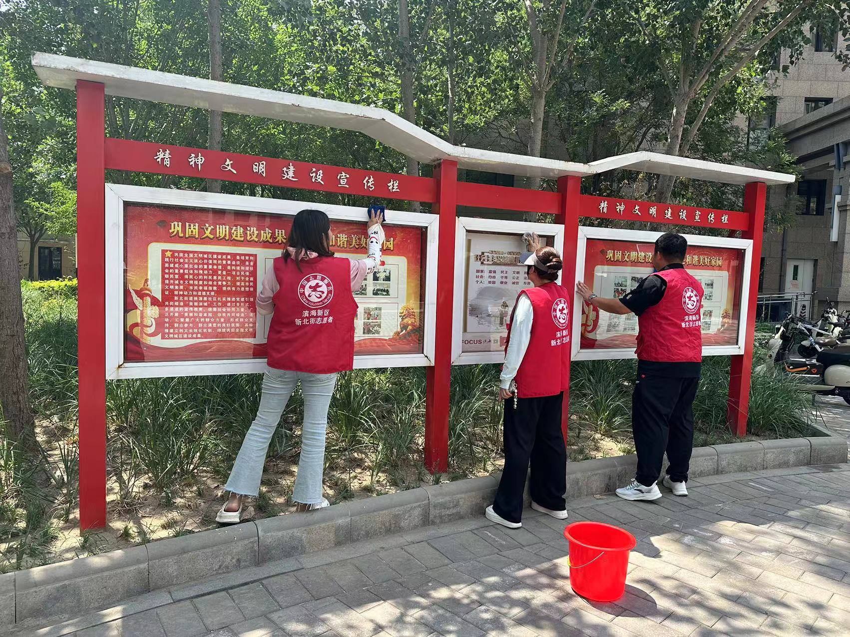活动当天,社工与志愿者们身着醒目的“红马甲”,精神饱满地投入到清扫工作中。大家手持抹布、水桶、扫帚、垃圾夹等工具,对小区内多个重点区域进行了细致清理。志愿者们认真擦拭小区内各处宣传栏的玻璃和边框,清除顽固污渍与过期海报,让政策宣传、社区通知的“窗口”焕然一新。儿童活动区域的滑梯、秋千、摇摇马等设施被仔细清洁消毒,地面上的落叶、纸屑、小石子也被彻底清扫,为孩子们营造了安全、卫生的玩乐空间。 针对小区内部分区域非机动车乱停乱放现象,大家齐心协力,将散落、倒伏的自行车、电动车逐一扶正,整齐有序地摆放到指定停车区域。此外,志愿者们还对主干道、绿化带内的白色垃圾、烟头等进行了捡拾清理,确保环境整洁无死角。
