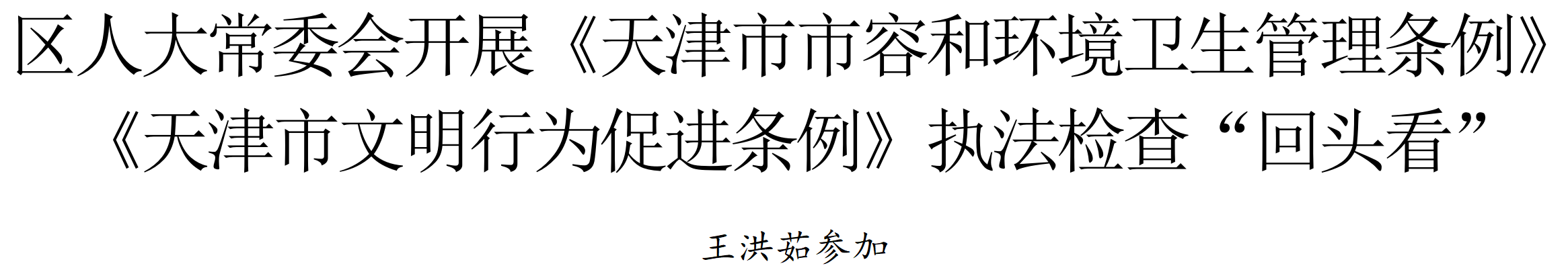 津滨网讯(记者 路熙娜)近日,区人大常委会主任王洪茹和常委会领导班子成员,分别带领执法检查组,以“四不两直”方式开展《天津市市容和环境卫生管理条例》《天津市文明行为促进条例》执法检查“回头看”。