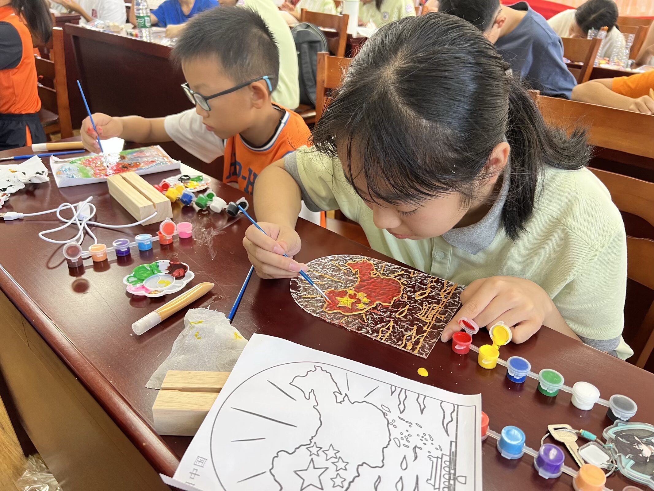 为了表达对英雄们的敬爱之情,随后孩子们开始制作红色主题手工台灯,在志愿者的细心指导下,孩子们纷纷拿起画笔,在透明玻璃板上尽情挥洒自己的创意和情感:鲜艳的五星红旗、盛世中华、伟大的中国梦……孩子们精心描绘,仔细勾勒,用自己的方式表达对祖国美好未来的无限憧憬。孩子们将绘画完的玻璃板插入木板底座,接通电源的那一刻,一盏盏精美的玻璃画台灯,照亮了孩子们的笑脸,也照亮了对党的忠诚和对祖国的热爱。