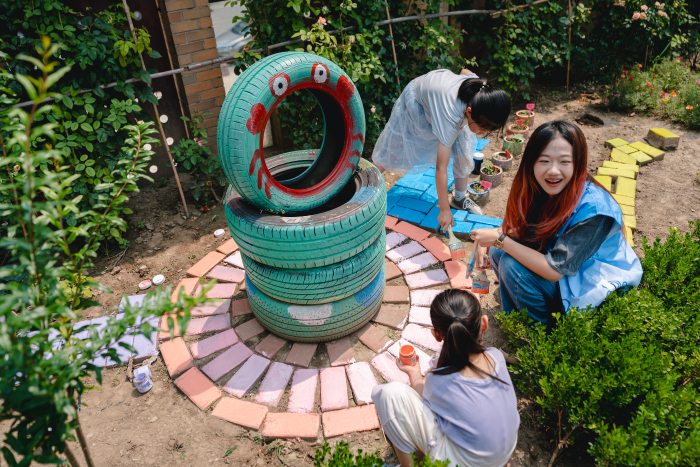 水岸社区联合滨海新区青少年事务社工站在南苑共享花园开展了焕新活动。辖区青少年志愿者齐聚一堂,在涂鸦区、地砖彩绘区、树枝DIY墙饰环节和绿地认领区发挥创意,为花园增添色彩。活动现场还设置了青少年志愿者服务兑换区,对青少年志愿者的付出给予肯定。“你看这花园现在多热闹,以前路过都没啥感觉,现在孩子们画的笑脸、棒棒糖,看着就心里亮堂。”居民赵先生说,“最难得的是看着孩子们一起忙活,你帮我递画笔,我帮你扶板子,咱们家长在旁边聊着天,不知不觉就熟络起来了,邻里就该这样热热闹闹的。”