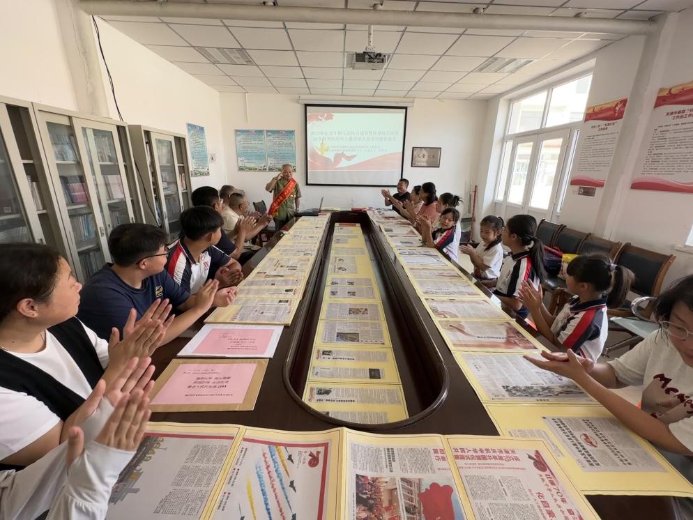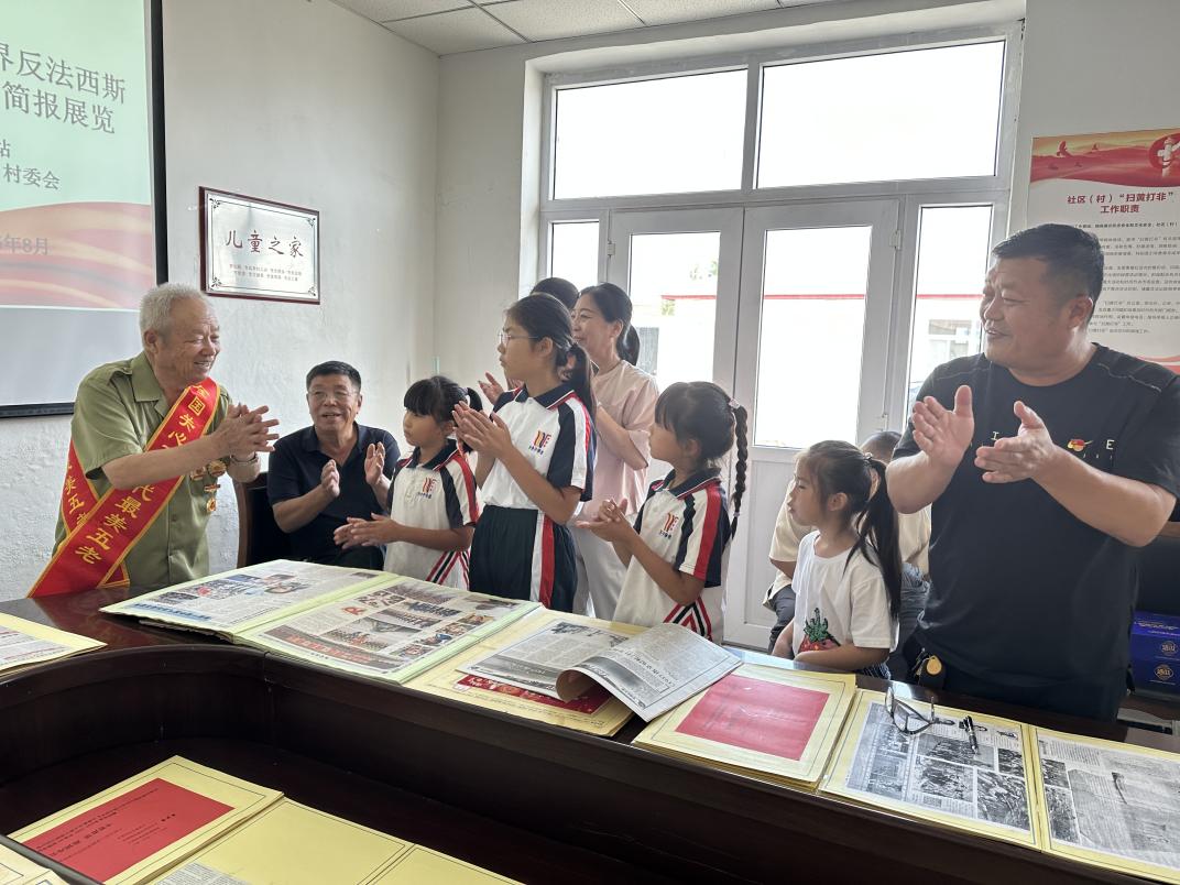 活动现场,一张张泛黄的“剪报”复刻着烽火岁月的印记。孙老先生和党总支书记方吉良化身“战地通讯员”,用铿锵有力的声音宣读着从史料中整理的“战时快讯”:1937年卢沟桥事变后,全国军民同仇敌忾、奋起抵抗的壮阔场景;平型关大捷打破“日军不可战胜”神话的振奋时刻;杨靖宇将军在冰天雪地中以草根树皮为食、孤身战斗至最后一刻的悲壮事迹;上海四行仓库八百壮士“宁死不退,誓与阵地共存亡”的决绝坚守……
