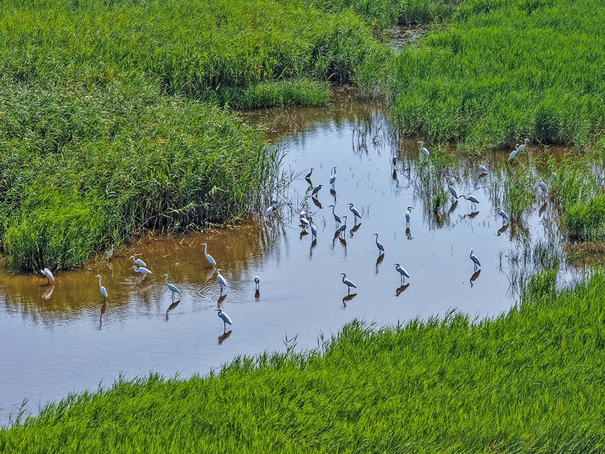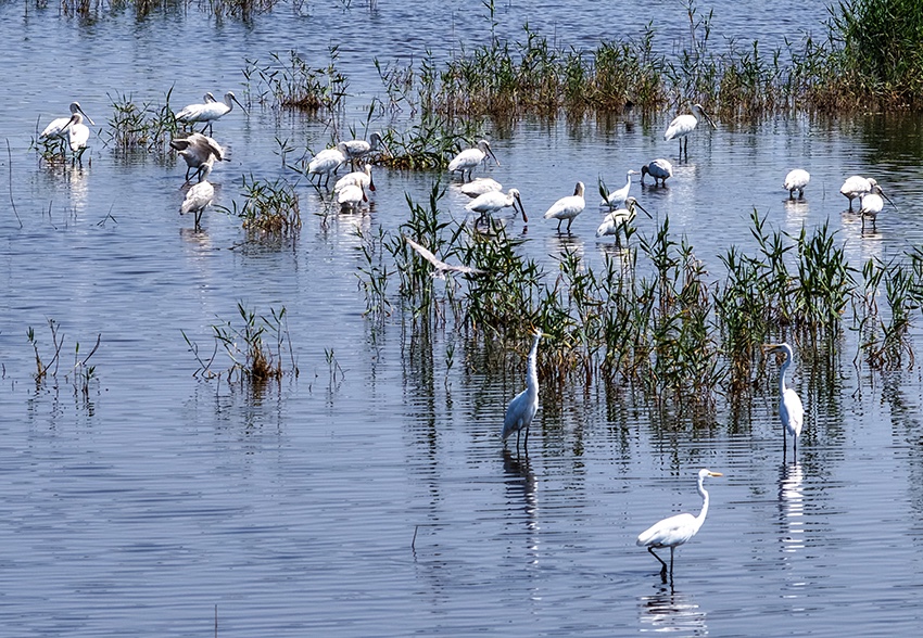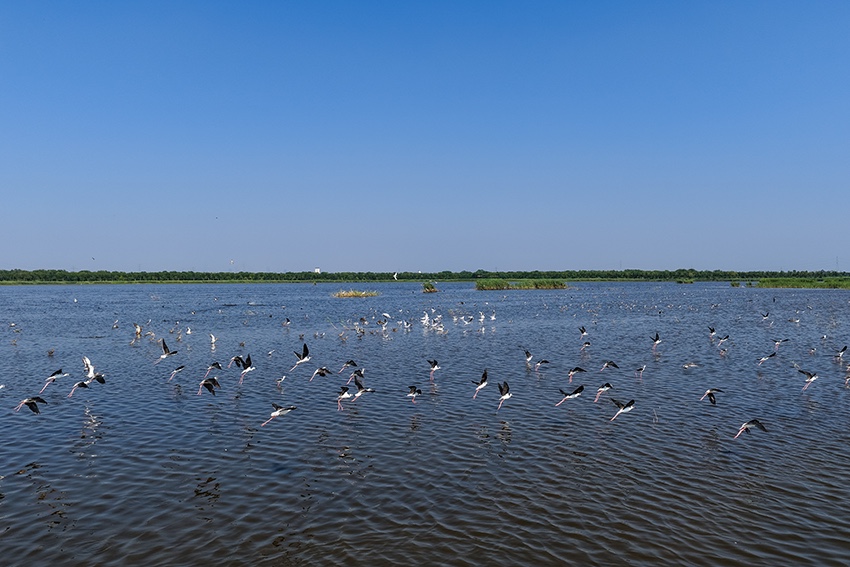 开阔水域上,上千只黑翅长脚鹬成了最亮眼的“主角”。它们身着黑白羽衣,拖着朱红色的细长双腿,在水面上时而低头啄食,时而振翅起飞,群鸟掠过水面时,翅膀拍打声与鸣叫声交织,宛如一场盛大的“水上舞会”。
