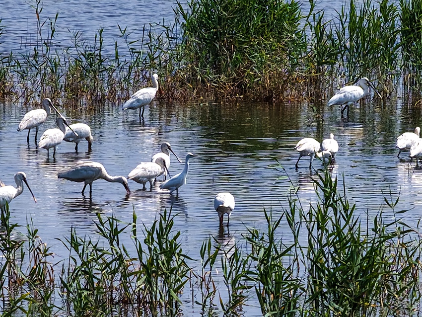 芦苇荡边缘,几只小白琵鹭正跟着妈妈学习觅食。成年白琵鹭迈开红色长腿在浅水中踱步,扁平如琵琶的喙在水里左右扫动,一旦触到小鱼便迅速叼起。身后的雏鸟们羽毛尚带绒毛,学着妈妈的样子探入水中,却总被晃动的芦苇秆干扰,时而歪头打量水面,时而扑扇着翅膀保持平衡,憨态可掬。
