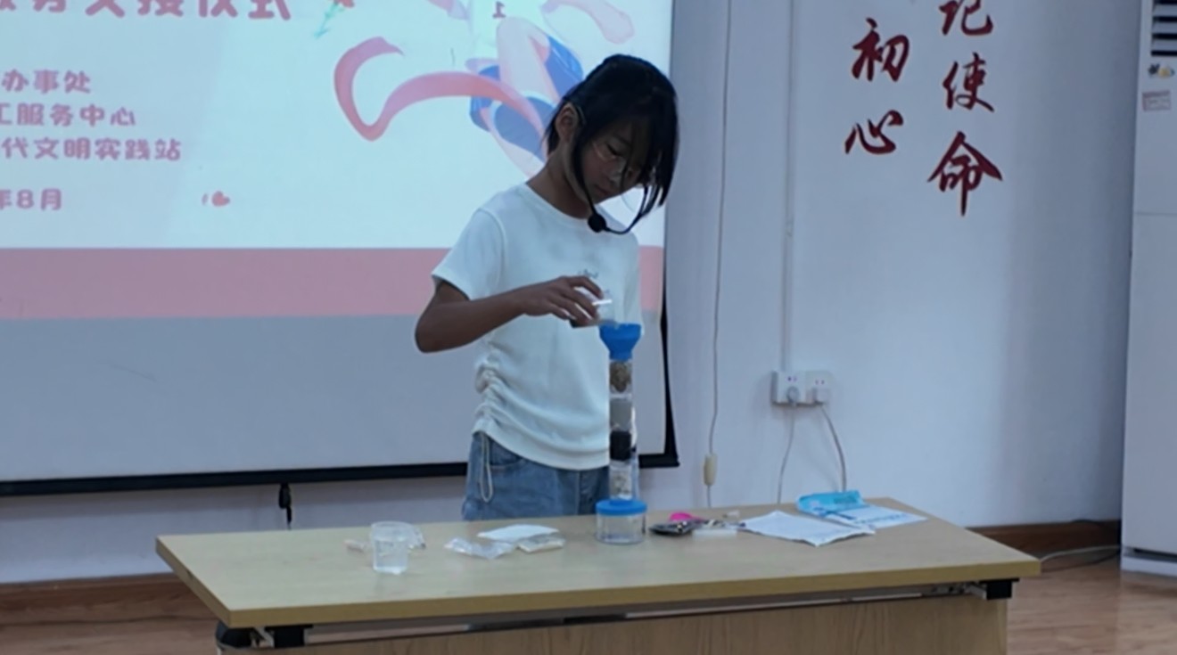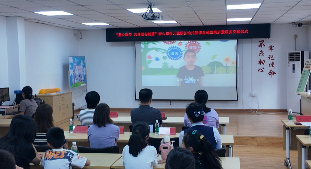 随后,工作人员通过PPT为大家展示了托管课堂的运营成果,涵盖课业辅导、兴趣培养、安全教育等多元服务内容,生动呈现了儿童在服务站的成长与收获。现场播放的儿童采访视频中,孩子们用稚嫩的语言分享了在托管课堂的快乐时光与点滴进步,真挚的表达打动了在场所有人。孩子们带来的精彩表演也成为一大亮点,科学实验《净水器装置》展示了孩子们的动手能力与科学探索精神,诗朗诵《我的祖国》则以饱满的情感传递了爱国情怀,赢得现场阵阵掌声。