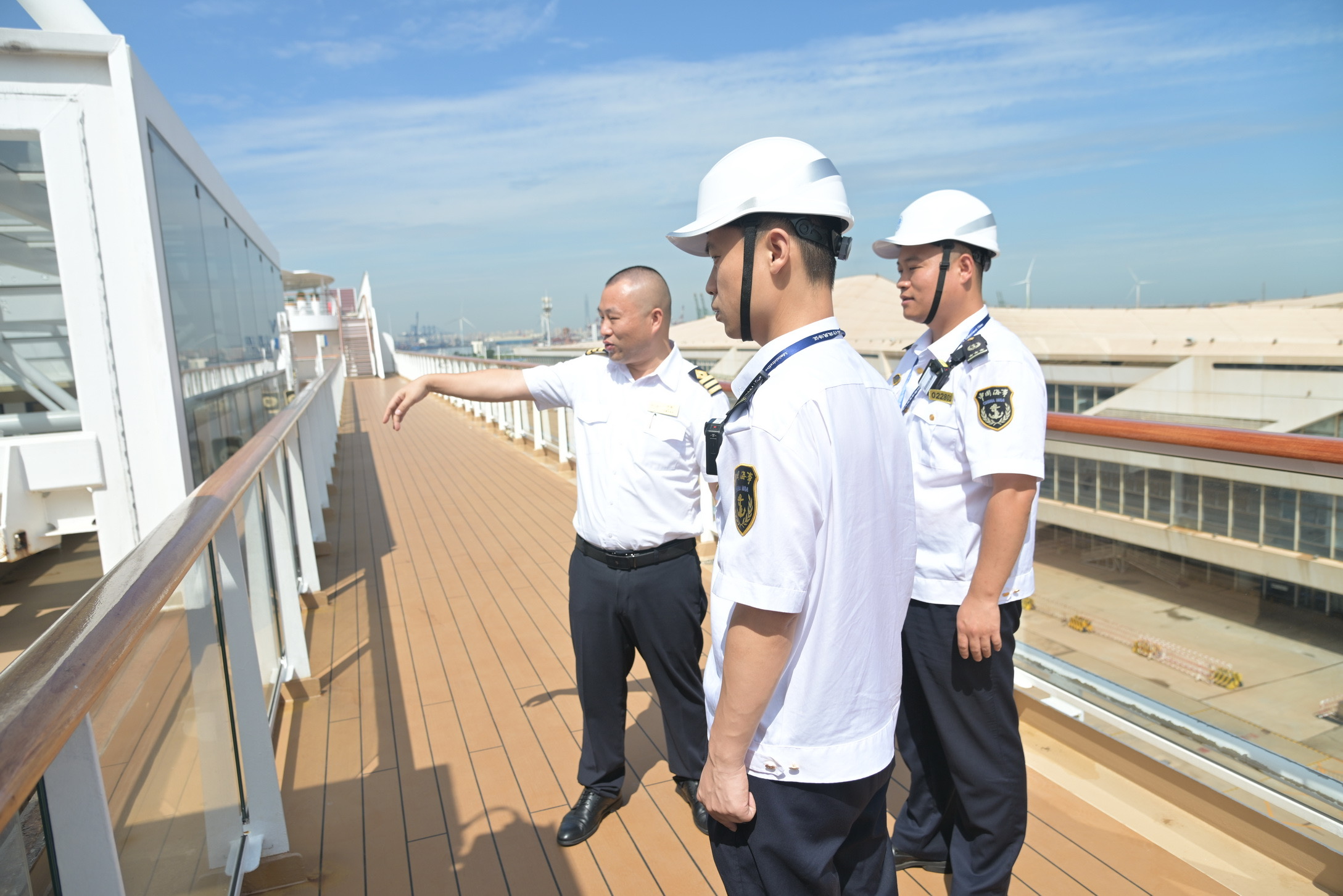 “因为‘招商伊敦’号是首次停靠天津国际邮轮母港,我们收到消息之后第一时间与港口部门、代理部门取得联系,要到了这艘船所有的传播参数和详细信息。提前对码头设施、航道环境等进行安全巡查,并在船舶靠港之后第一时间登轮。”东疆海事局邮轮海巡执法大队四级主办王鹏宇向记者介绍。
