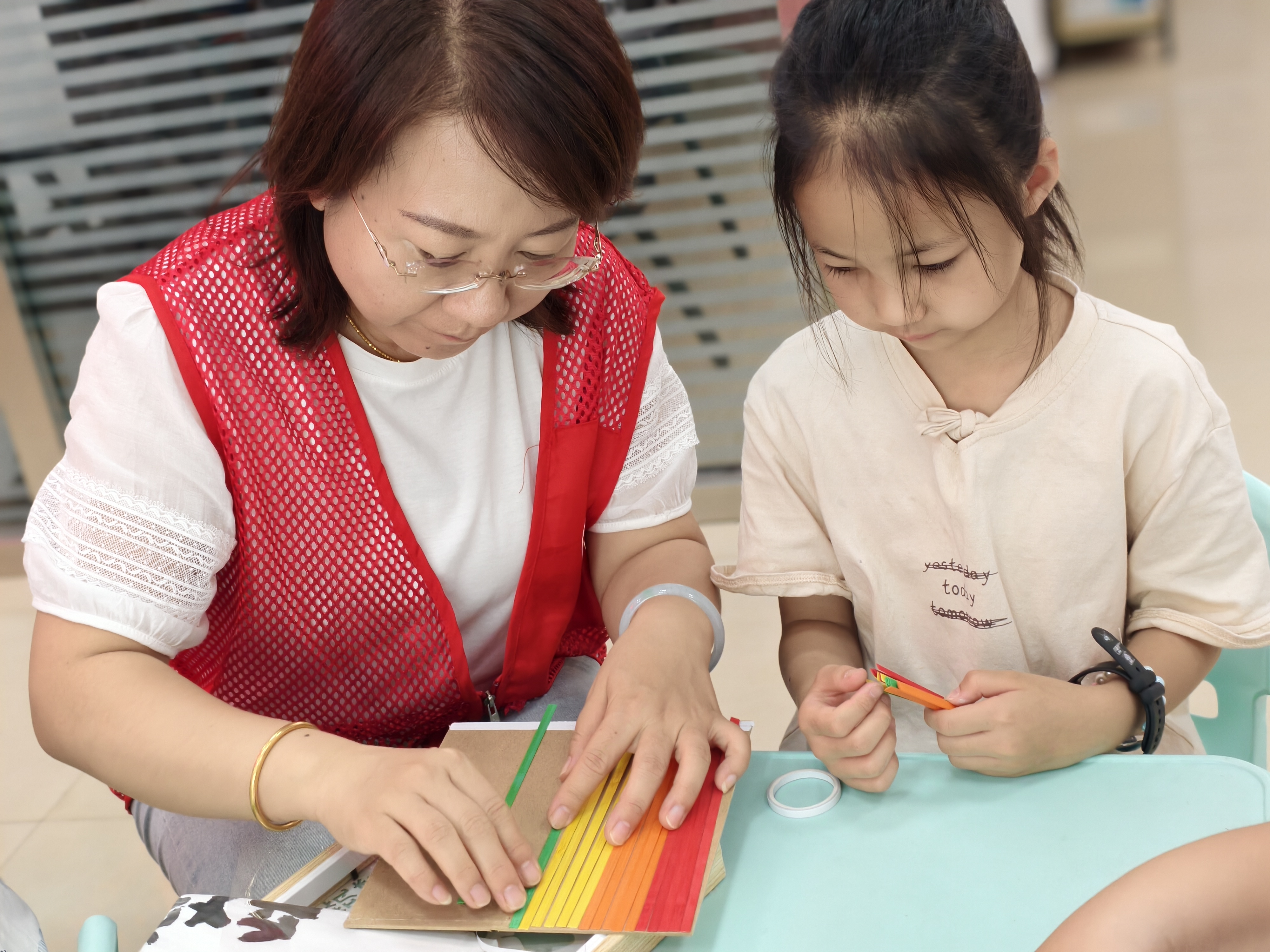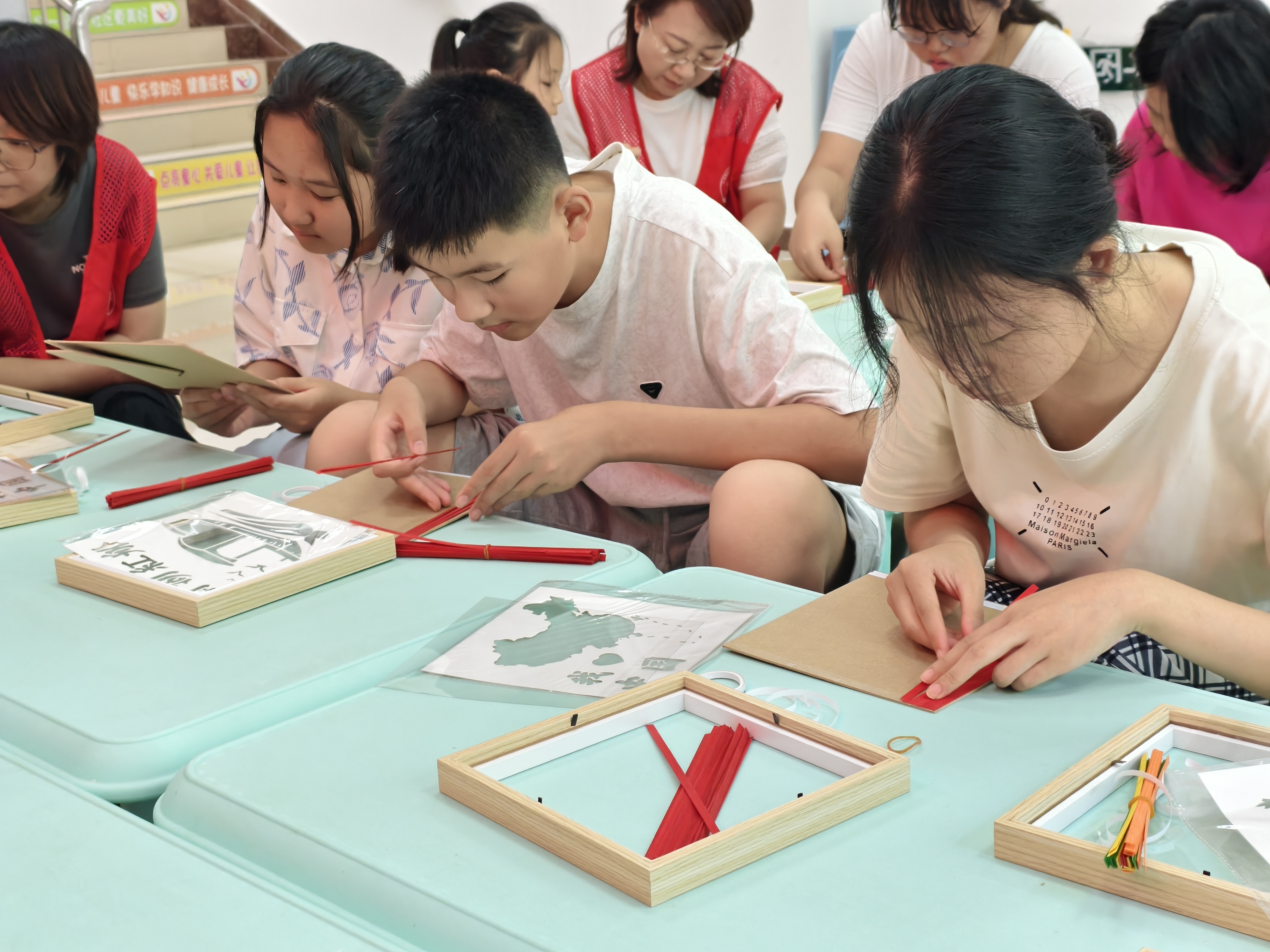 随后,竹编制作环节拉开帷幕。在工作人员的耐心指导下,孩子们拿起纤细的竹条,从简单的编织手法学起,一步步将竹条编织成一幅幅寄托着爱国情怀的竹编画。有的孩子编织出鲜艳的五星红旗,有的勾勒出壮丽的山河图景,还有的用心编织出“我爱祖国”等字样。指尖的灵动与心中的热爱相互交织,原本普通的竹条在孩子们手中变成了一件件充满童趣与深意的艺术品。