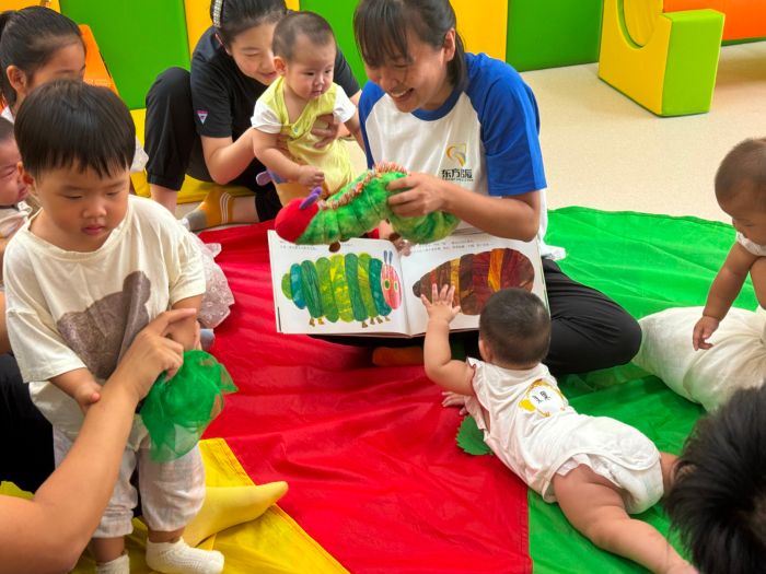 接下来,在刘欣等多位老师的陪伴中,《五只小猴荡秋千》和《两只小鸟》的手指谣游戏把宝宝们的注意力成功吸引过来,随后在《peek a boo》的中英文双语歌声中,配合着柔和的彩色丝巾,宝宝们的情绪也被调动了起来。《Walk and Stop》舞蹈游戏、彩虹伞亲子游戏、绘本《好饿的毛毛虫》以及现场的自由感统运动,这一系列的精彩活动,宝宝和家长们玩得不亦乐乎。