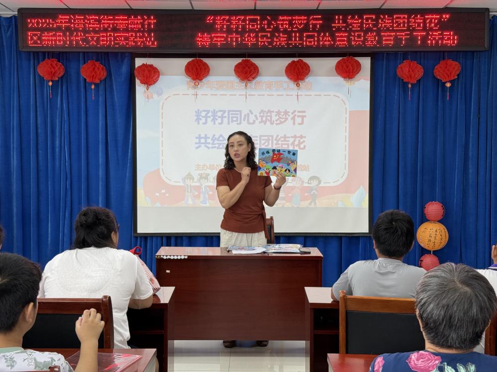 “我国有多少个民族?”“哪个民族有泼水节?”……活动开始,志愿者老师采用问答方式,用浅显易懂的语言,向参与活动的小朋友们形象地讲解了不同民族独特的风俗习惯与文化特色。随后,老师又阐述了中华民族“像石榴籽一样紧紧抱在一起”的深刻寓意,引导孩子们深刻理解铸牢中华民族共同体意识对于国家繁荣、社会和谐与个人成长的重要性。孩子们听得津津有味,在欢声笑语中增长了见识,种下了民族团结的种子。