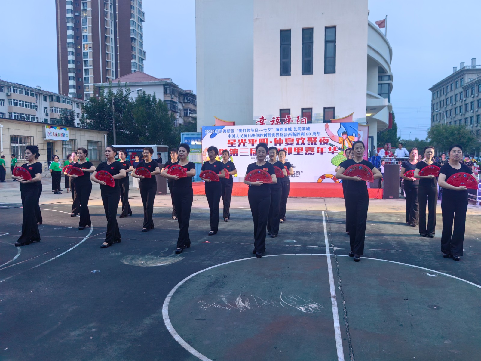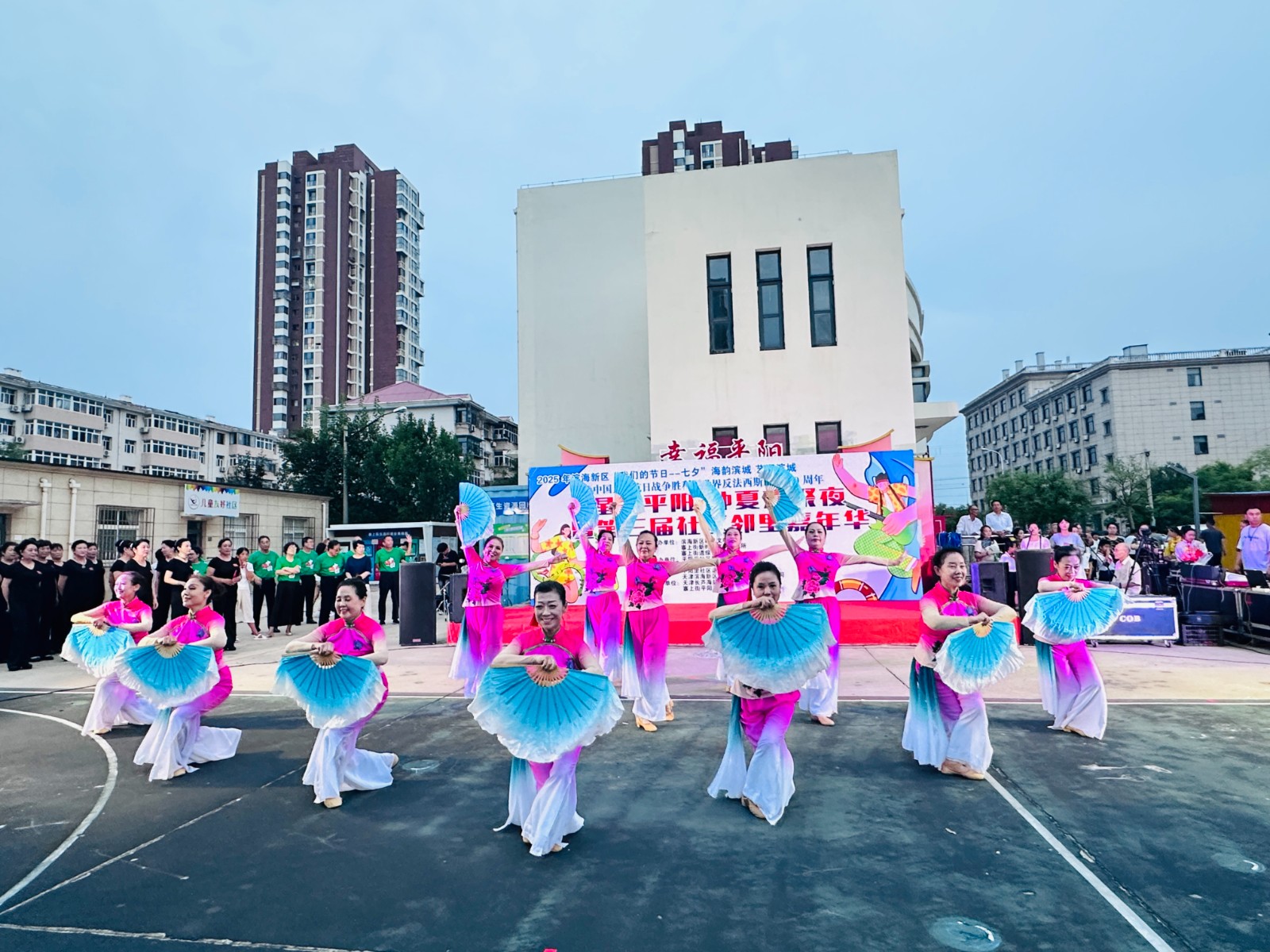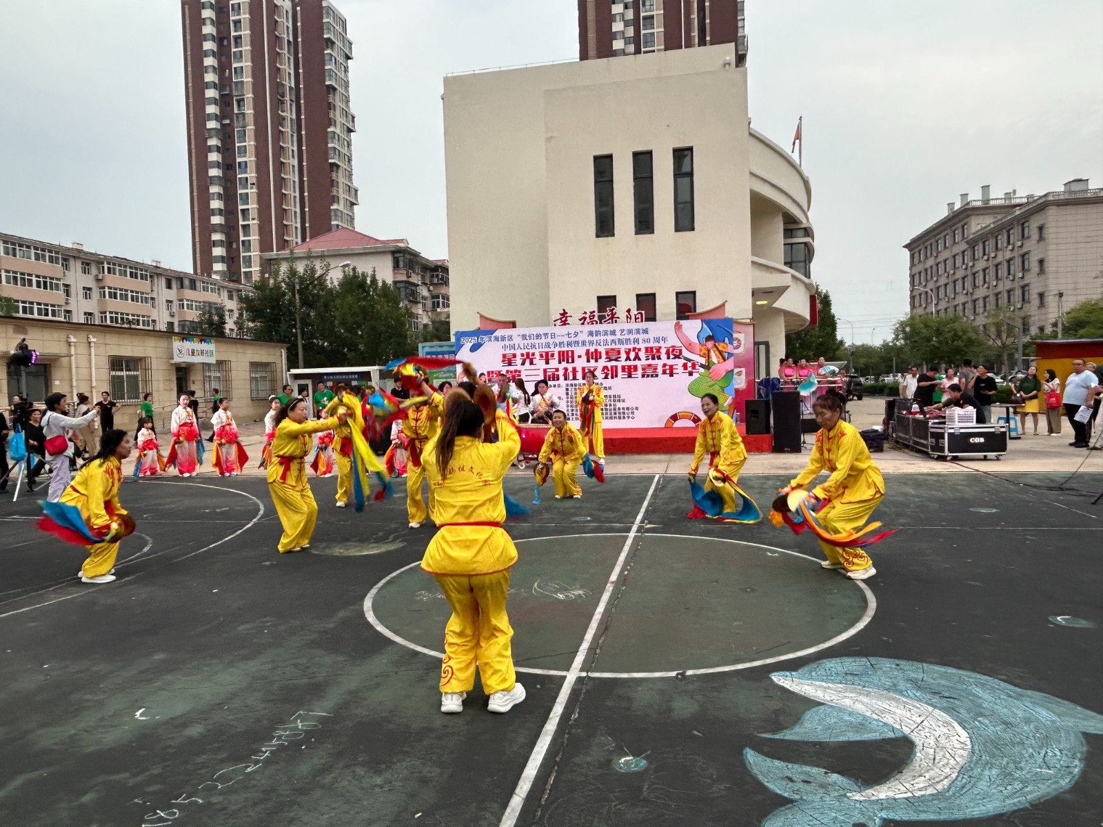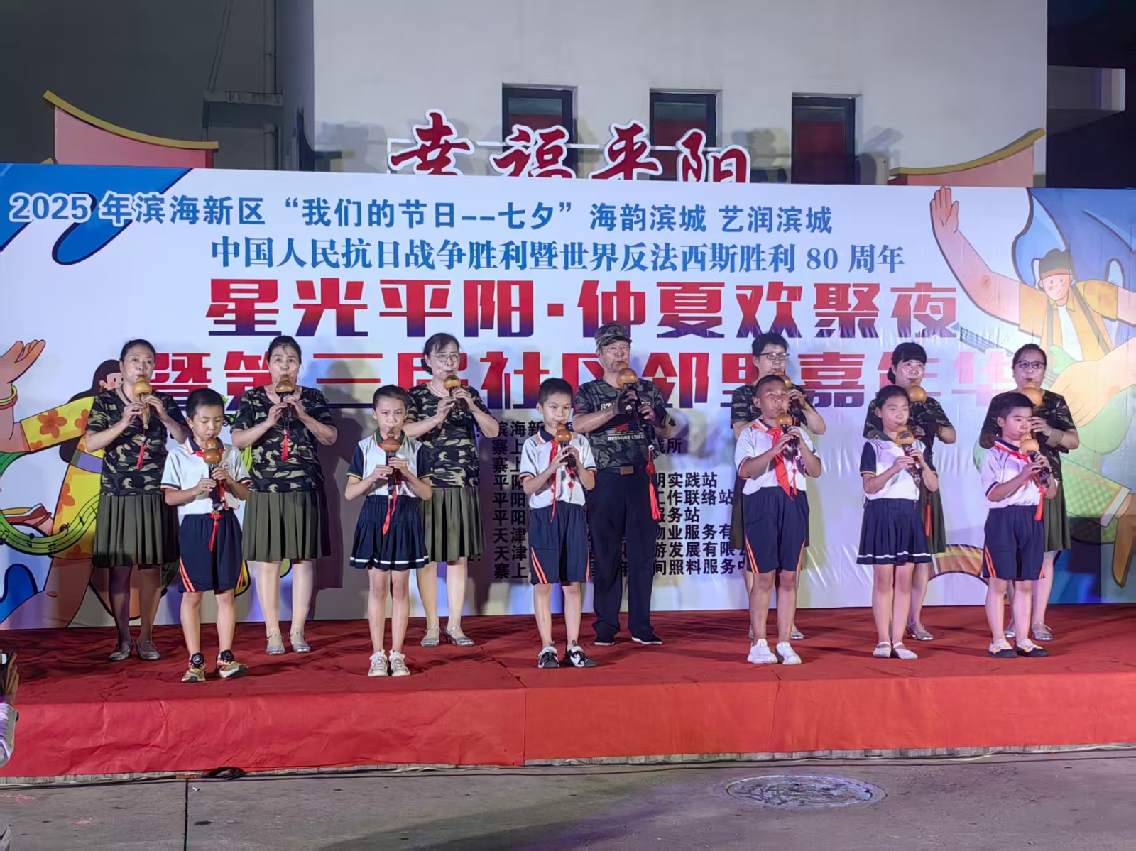 整场晚会节目形式多样,内容丰富多彩。激昂奔放的开场飞镲瞬间点燃现场气氛,随后登台的芳华舞团以《海边渔情》 展现了浓郁的渔家风情。华夏艺术团的模特折扇秀《盛世国风》优雅婉约,社区工作人员带来的歌曲《风吹麦浪》亲切动人,赢得了现场观众的阵阵掌声。传统戏曲表演尤为引人注目,展现了传统文化的魅力。大乐透乐队和潮汐乐队的登场将晚会推向高潮,现场瞬间变成大型合唱现场,居民们跟着节奏挥手跟唱,气氛热烈。