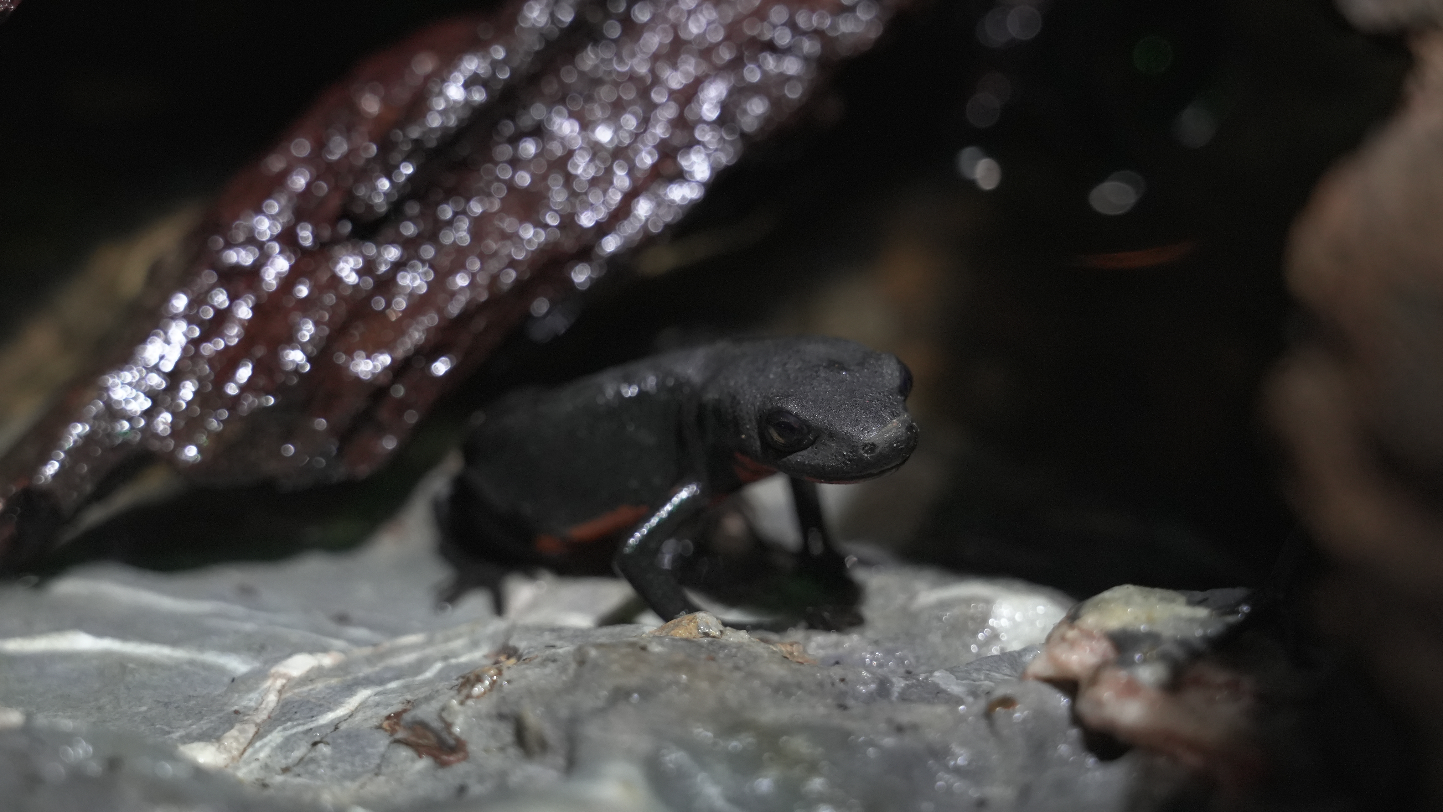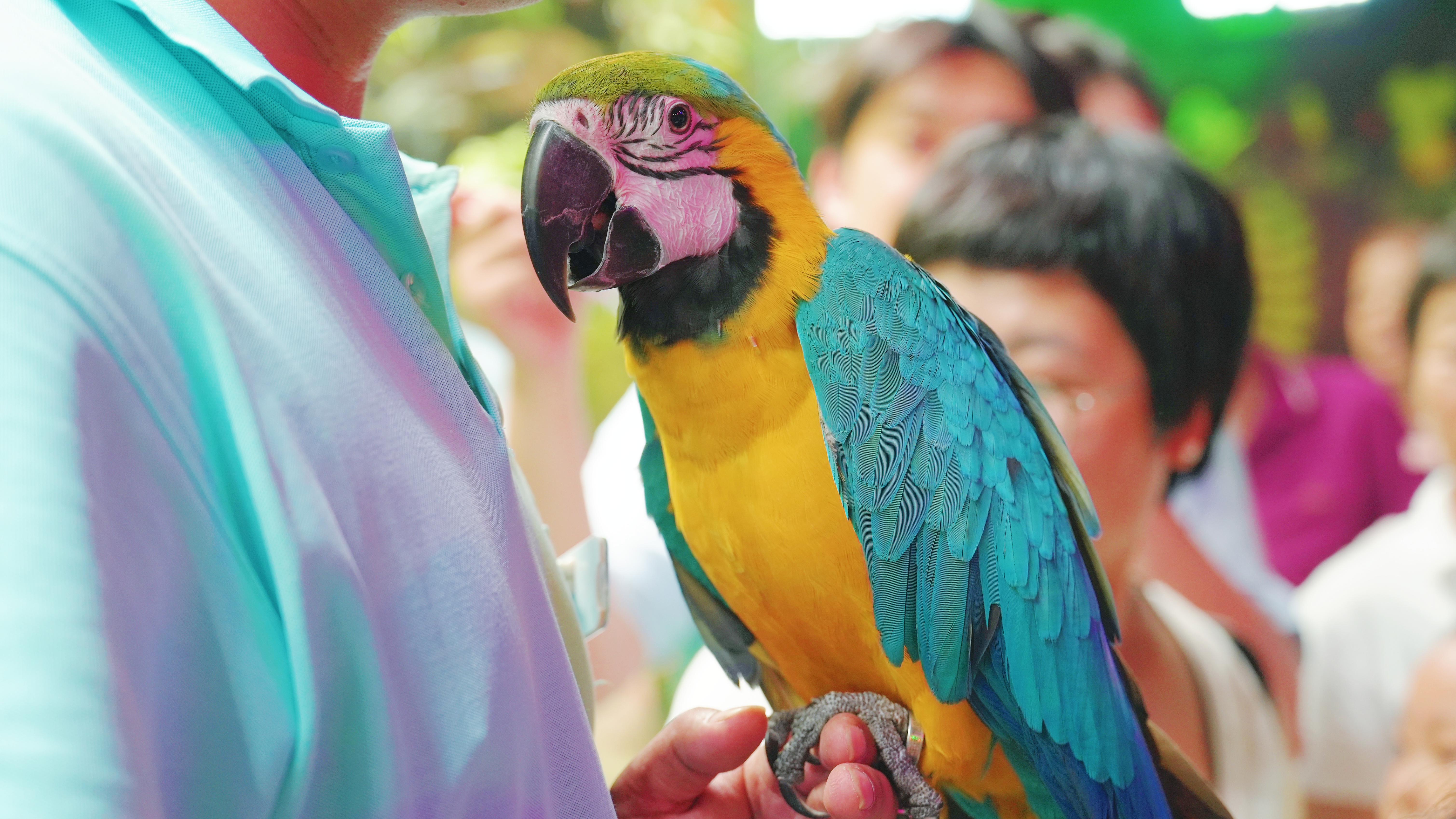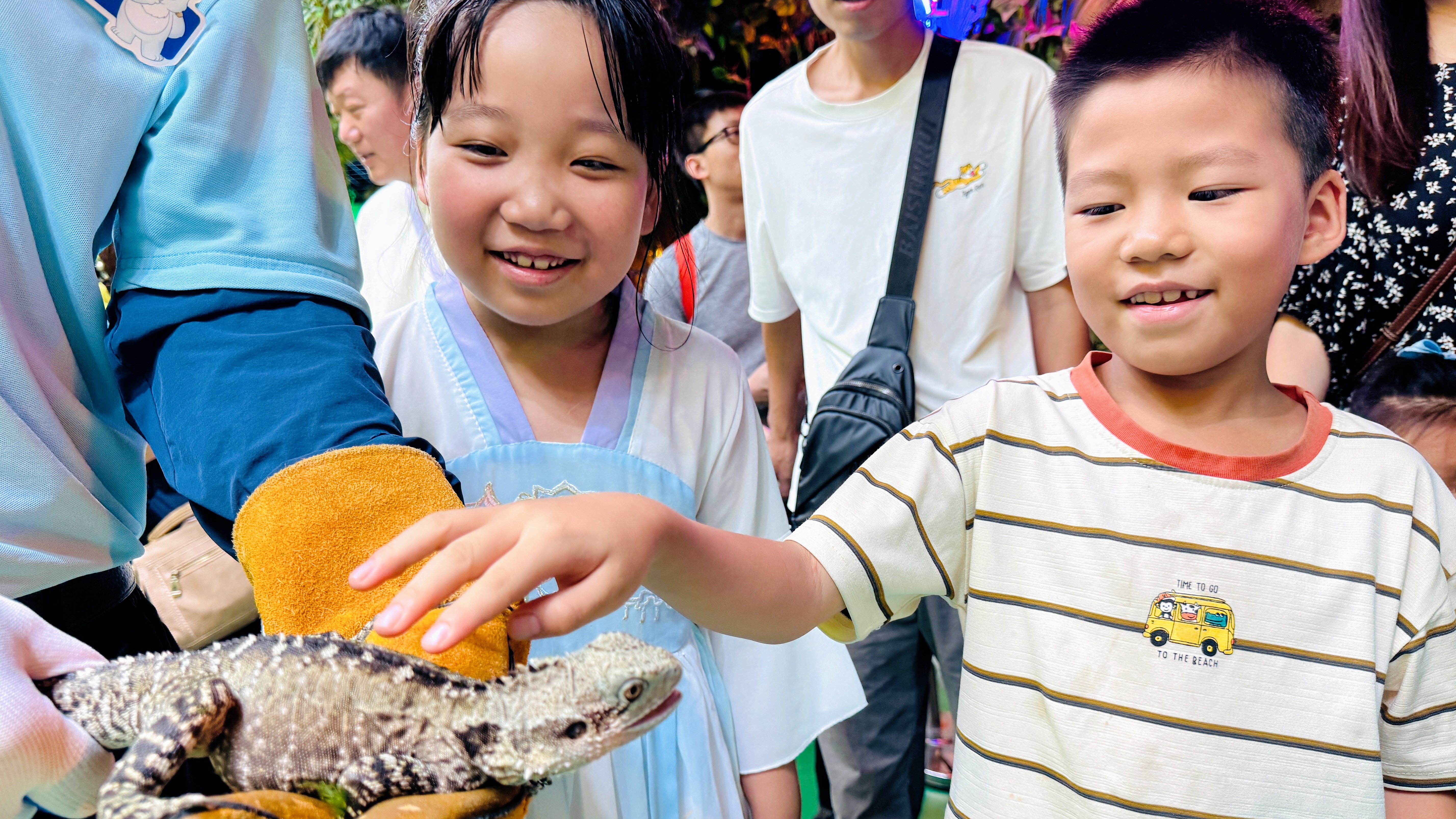 活动现场,小朋友们在工作人员的带领下走进天津极地海洋度假区。在奇妙雨林区,三种截然不同的生命互动正在同步发生:一只蓝黄金刚鹦鹉安静地停驻在饲养员的手臂上,当游客的指尖轻触它丝绒般的飞羽时,讲解员会轻声解释它是生态系统的“种子信使”,并介绍它们的传播轨迹及方式。而另一位饲养员摊开的手掌上,澳洲水龙如翡翠雕塑般安静匍匐,好奇地观看着周围,解说员则引导游客用指背感受水龙侧腹的鳞片。不远的展箱中,蝾螈“小火龙”在水中划出涟漪,悄悄爬过树干,等待着游客的抚摸互动。