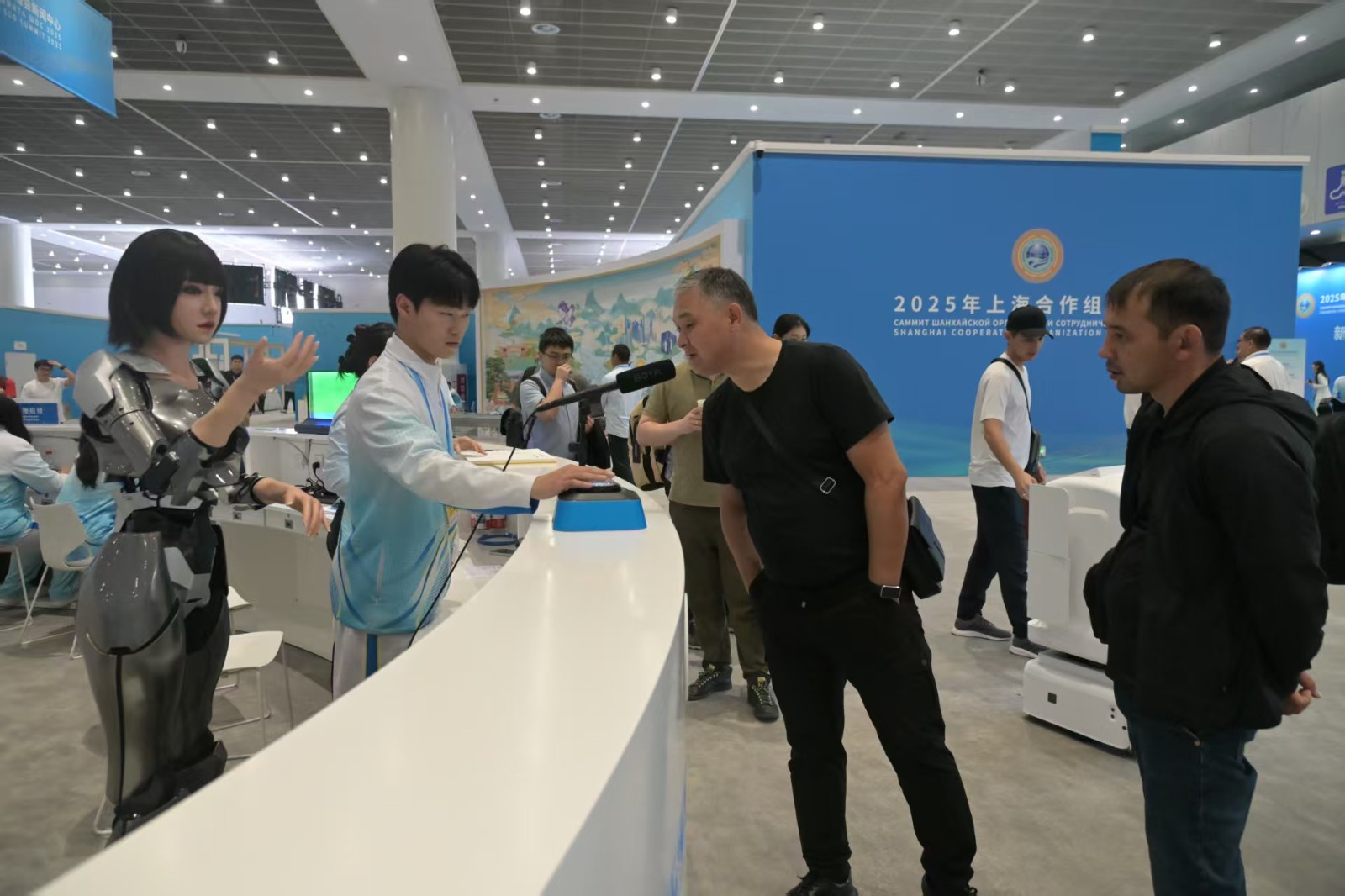 在综合服务区,这里能为来自全球的记者朋友提供信息咨询、资料发放等服务。现场, AI志愿者“小合”拥有高仿真的表情与肢体动作,可用中、俄、英三国语言,配合工作人员及志愿者,为记者提供信息咨询、场地指引及大会资讯等全方位服务。