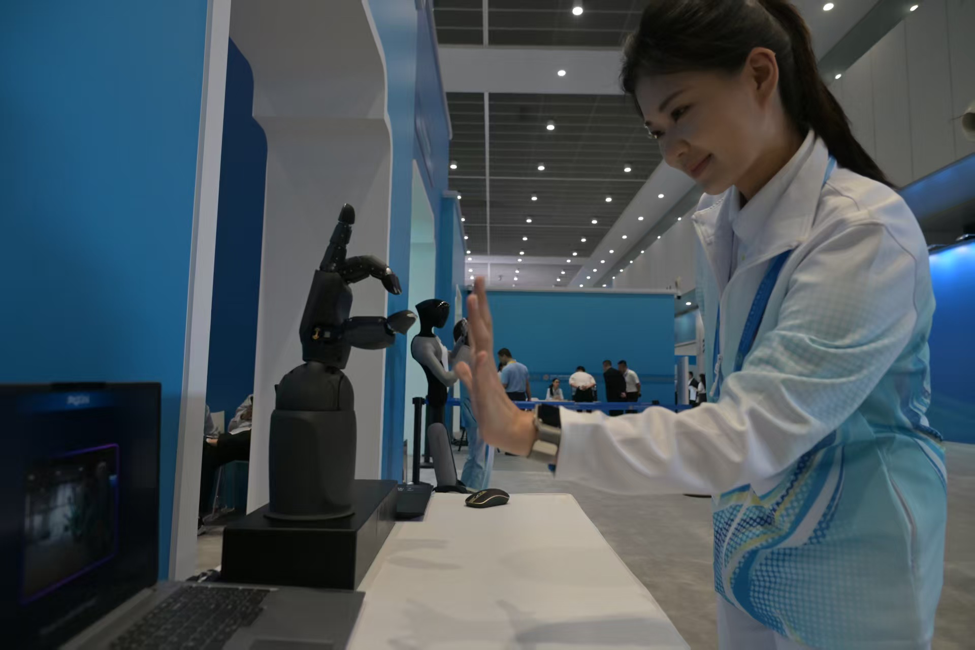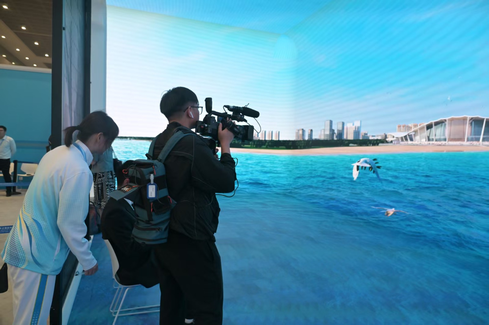 新闻中心的科技文化互动展区尤其受到记者关注。在该区域,记者可参与CAVE 8K 超高清沉浸式体验。例如,当大屏播放海水场景时,装置会同步释放海水与苔藓的咸香味,出现清晨树林画面时,又能闻到对应的清新空气香味。这种视、听、触嗅一体的新技术,让虚拟画面与真实感官完美交融。此外,大家也能在现场品尝一杯机器人制作的咖啡,感受智能机器人书法家现场“泼墨”,体验数字化“纸鸢漫游”等,感受智能科技赋能生活的多姿多彩。
