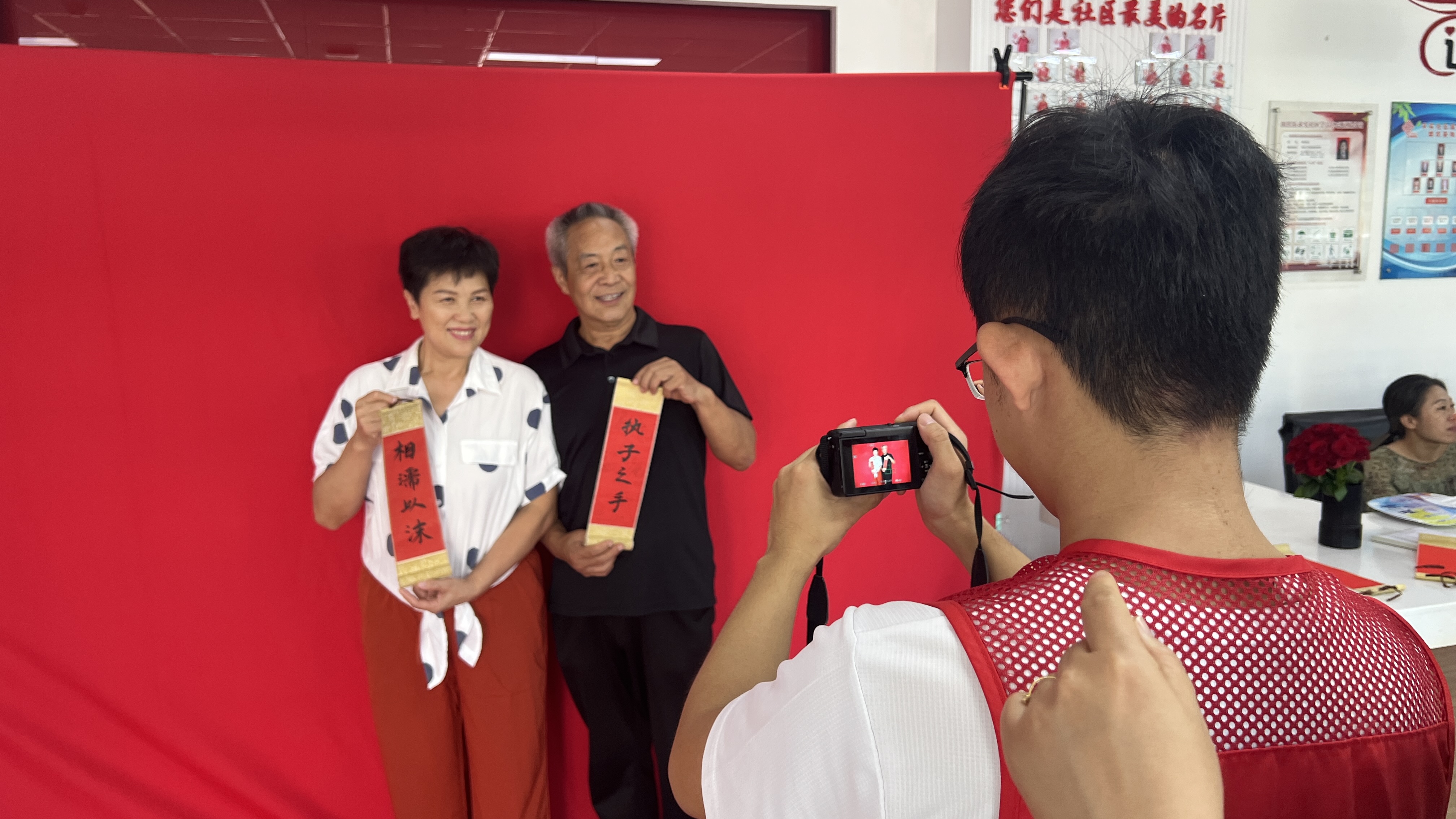 活动前期,社区通过网格群发布通知、入户邀请等方式,提前统计参与居民的报名信息,并精心布置了拍摄现场——红色背景布烘托出温馨喜庆的氛围。社区还专门为每对夫妻准备了手捧花、小对联等拍摄道具,让老人居民在细微之处感受到浓厚的节日仪式感。