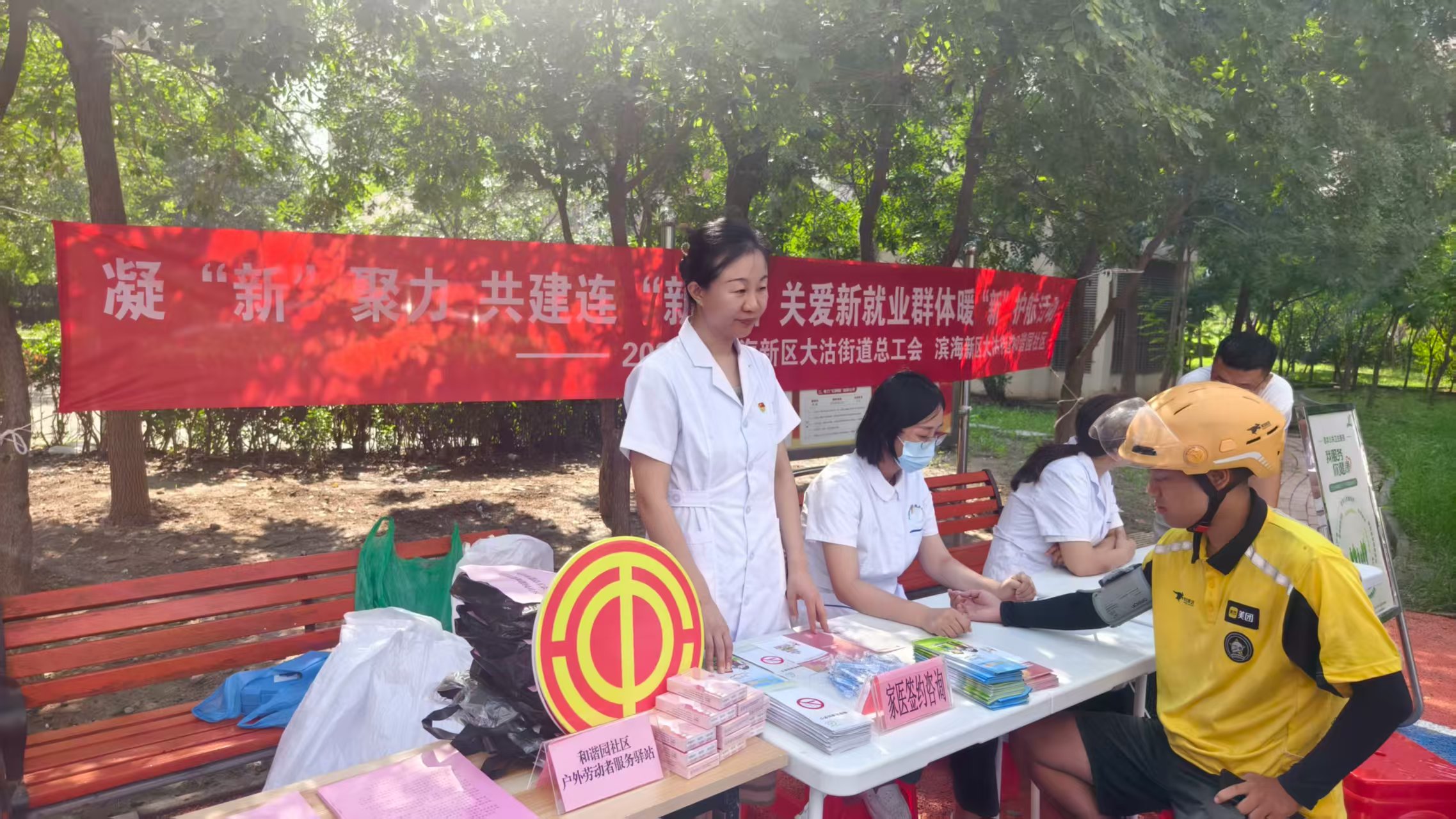 同时,驿站特别邀请大沽医院医护人员驻场提供健康义诊服务,同步发放夏季防暑、防雨安全知识宣传单页,细致讲解高温防护要点与雨天出行注意事项,助力大家在夏日安全作业。