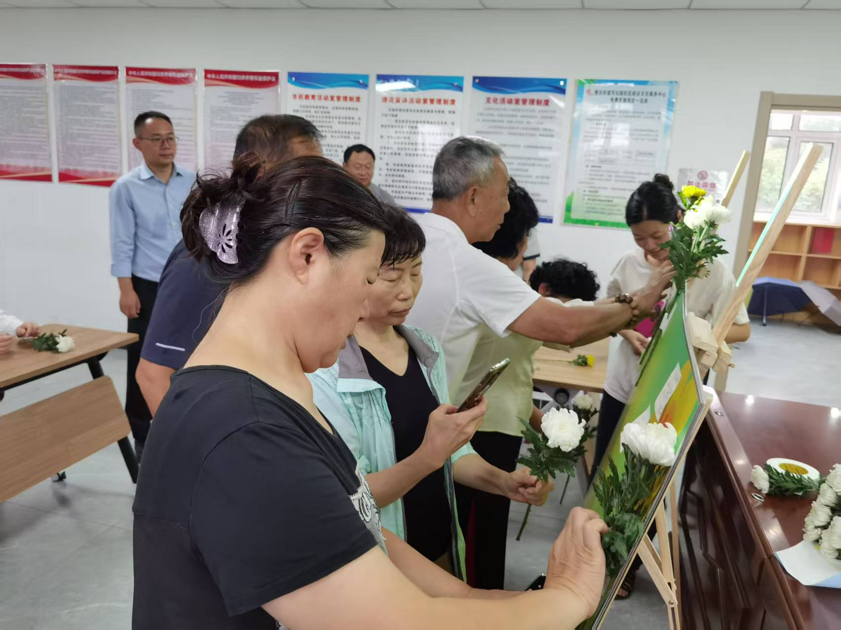 最后,“献花寄情”环节温馨开启。居民们有序领取菊花,缓缓走到台前,轻轻放下鲜花,鞠躬致敬。不少家庭带着孩子参与其中,家长们借助此次活动向孩子讲述先辈事迹,让感恩与缅怀的种子在下一代心中悄然扎根。