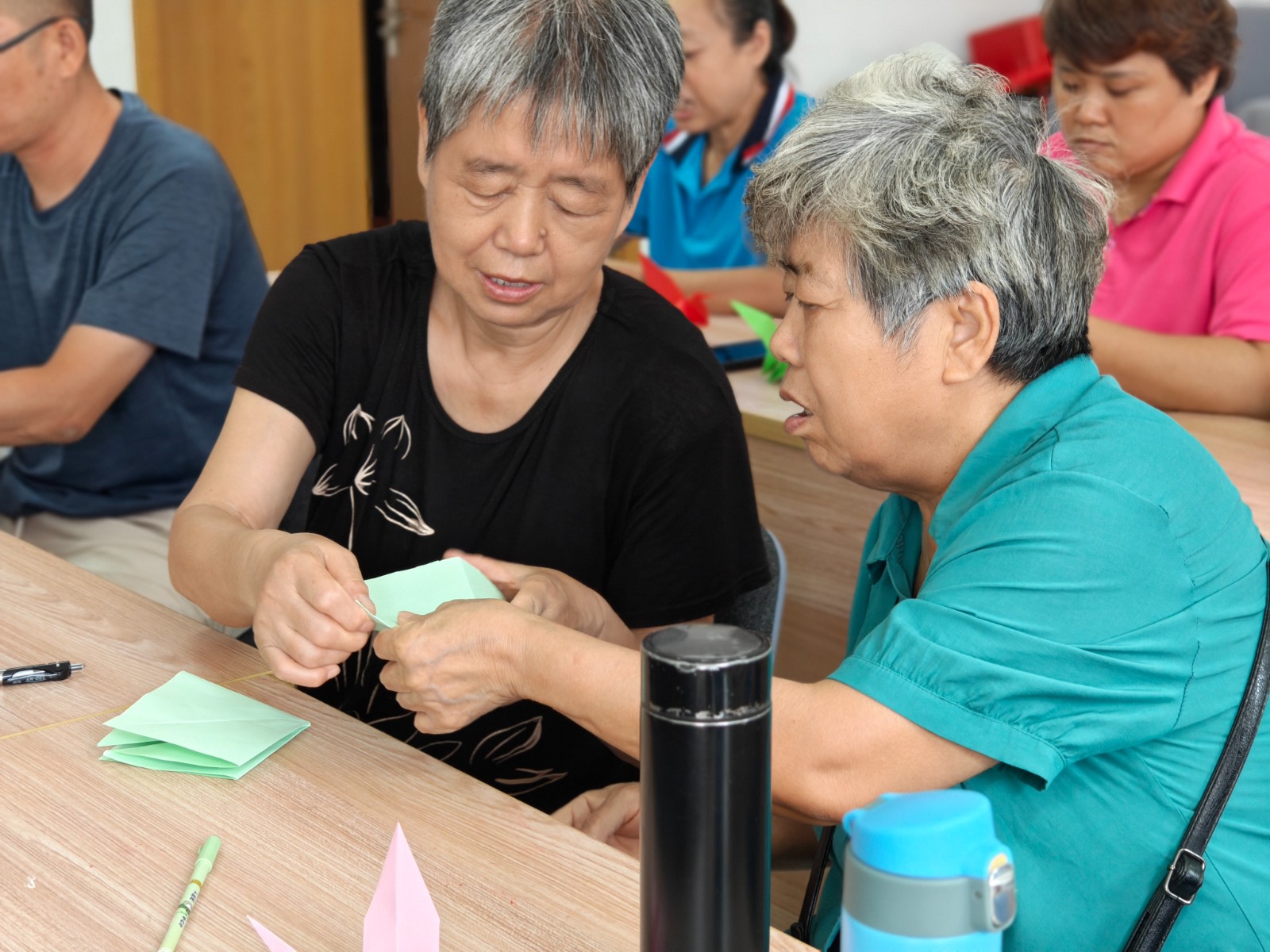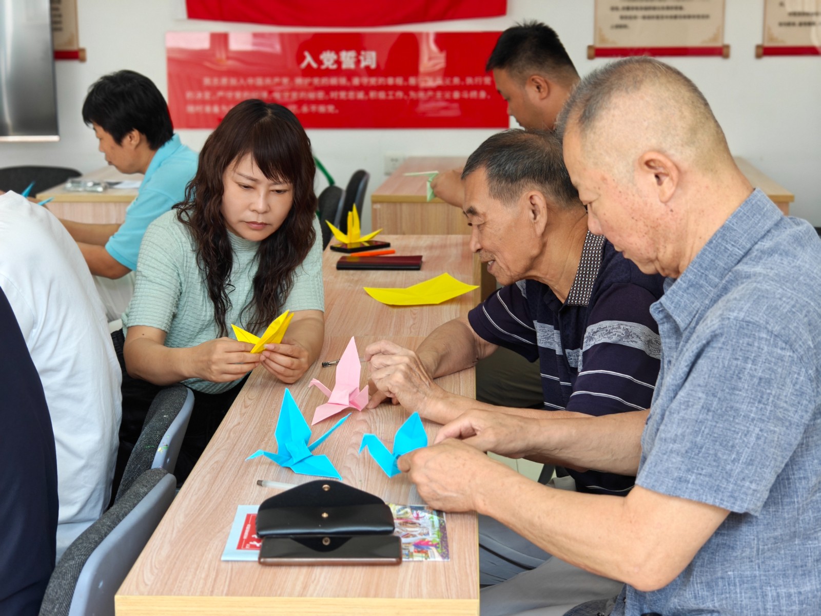 在互动环节,社区工作人员引领居民开展“折鹤寄思”活动。从纸张的对折、翻折到翅膀的塑形,工作人员都耐心地进行一步步示范。遇到年纪较大、动手能力稍弱的居民,工作人员还会手把手地给予辅助指导。“以前烧纸的时候,心里总是七上八下的,生怕一不小心惹出麻烦。今天折千纸鹤寄托思念,安安静静的,心里反倒更踏实了。”居民刘叔叔看着手中的千纸鹤,脸上浮现出欣慰的笑容。