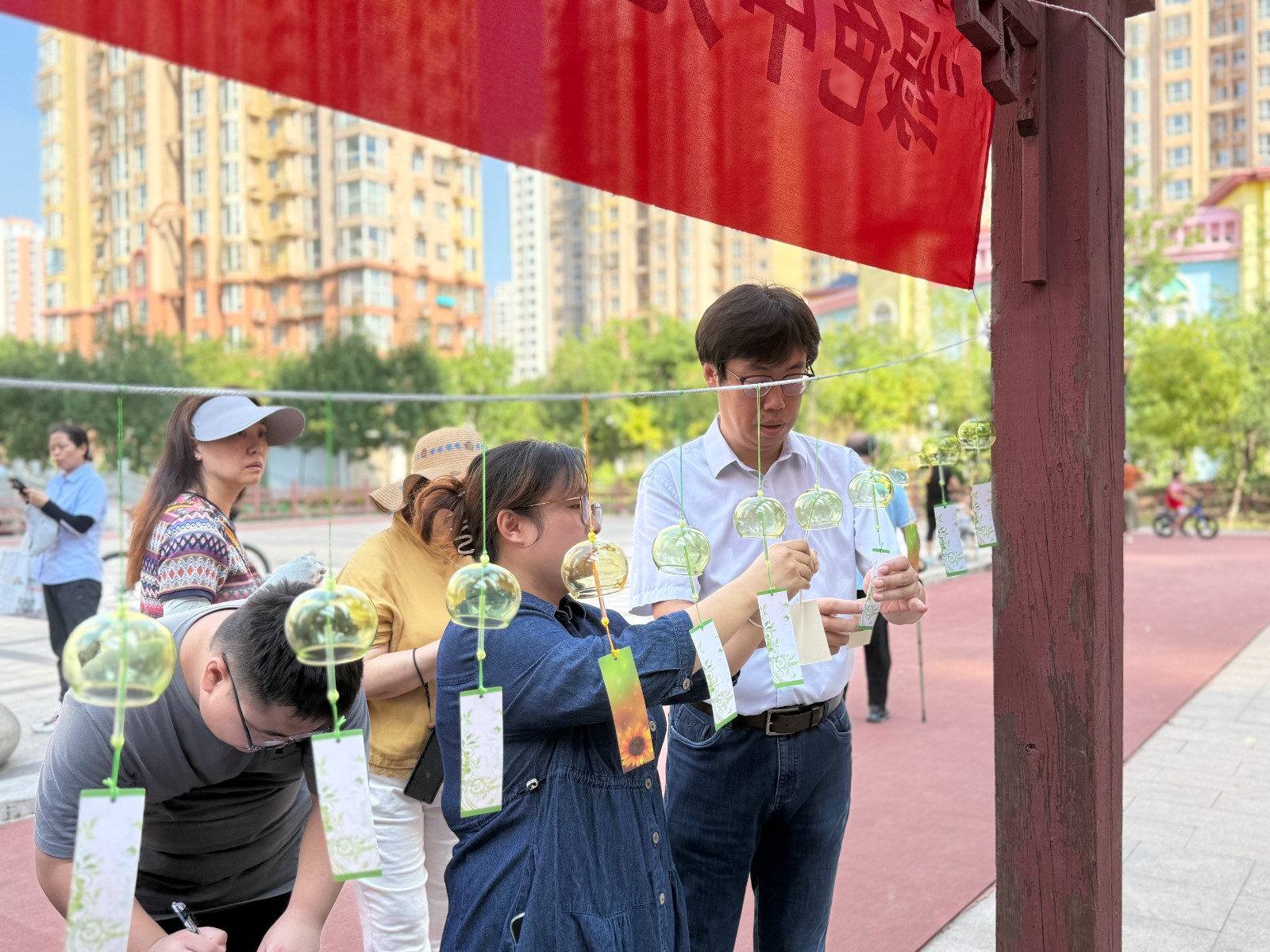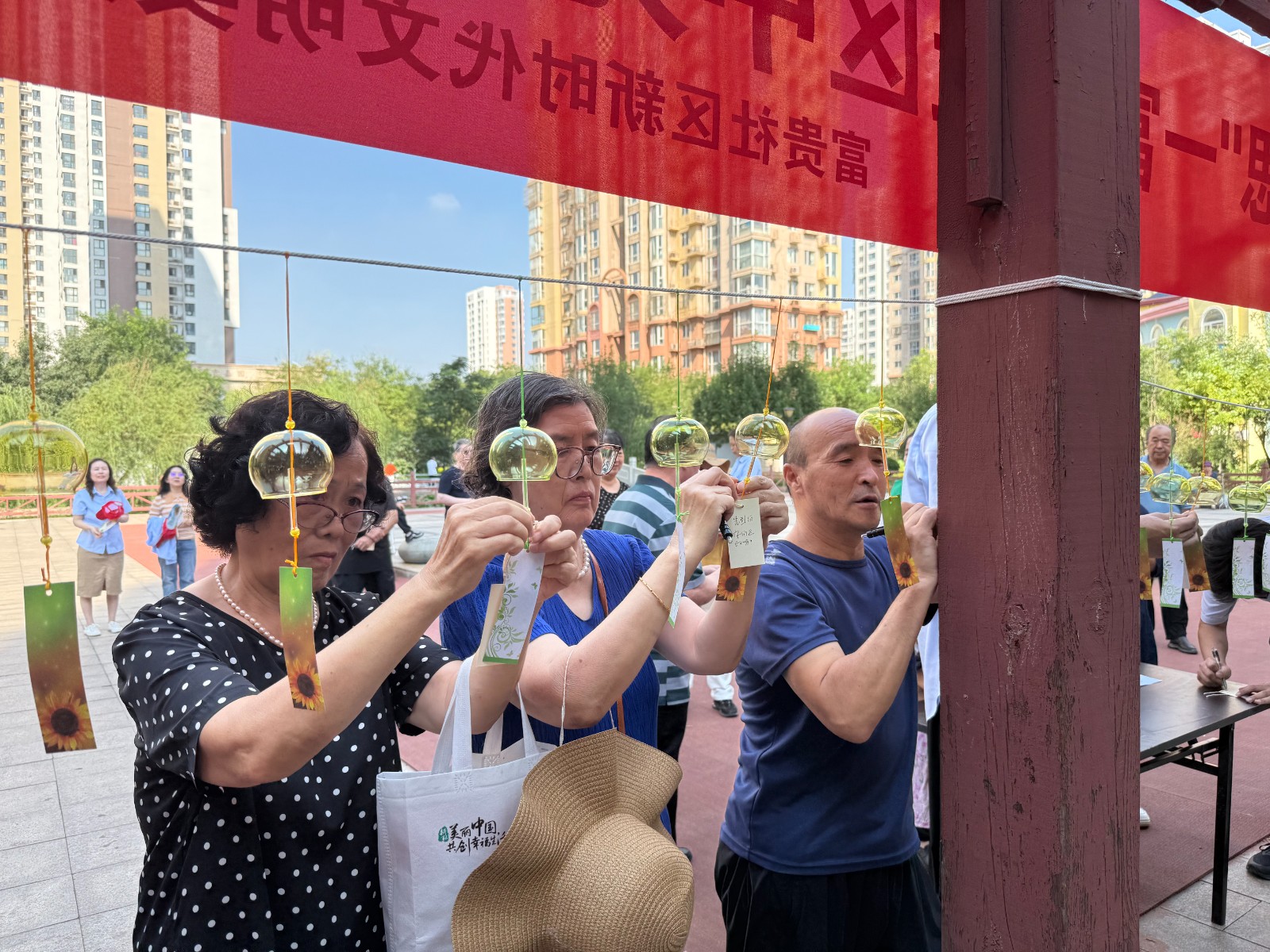 在“风铃寄思”环节,居民们满怀深情地写下对亲人的思念与祝福,诸如“您在那边还好吗”“我们都很好,放心吧”等真挚话语,被一一系在风铃之上。随后,大家有条不紊地将风铃悬挂在“思念绳架”上。微风轻轻拂过,风铃悠悠作响,仿佛在将这份牵挂传递给远方的亲人,让思念有了温暖的“载体”。