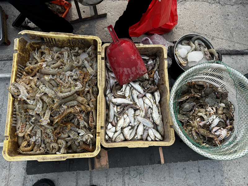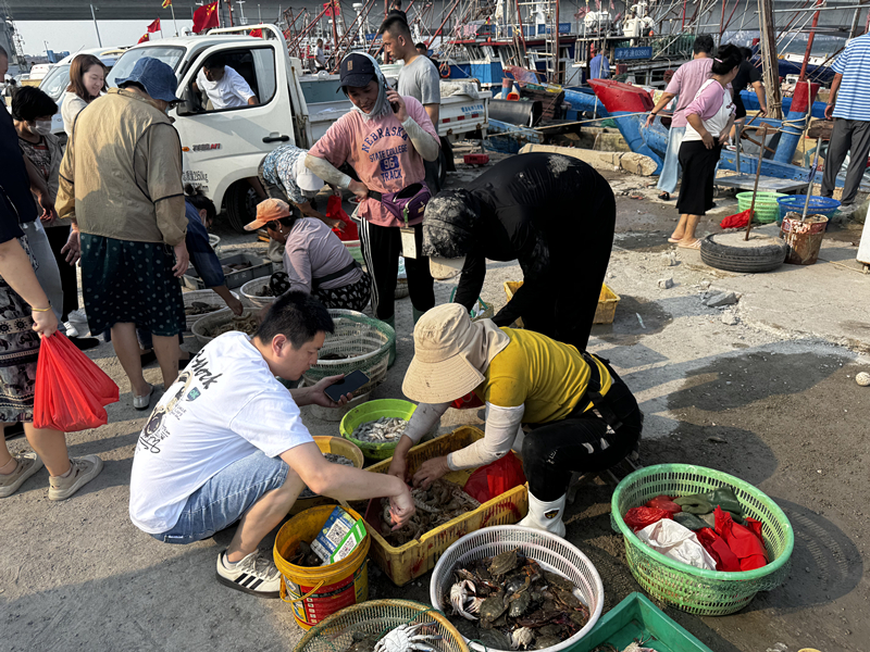 不远处的渔港市场同样人头攒动。随着渔获上岸,摊位迅速摆开,吆喝声、讨价声此起彼伏。皮皮虾每斤15元,螃蟹每斤25元,平鲷每斤10元,价格实惠,吸引了大批市民和批发商采购。“开海第一天的海货格外新鲜,我们特意赶过来买一些,家里人都盼着品尝呢。”市民刘女士拎着一袋螃蟹,脸上满是笑容。记者在走访时看到,现场不仅有零散的顾客手提小袋、拎着小筐选购,更有批发商大量采购、整箱搬运,交易现场热闹非凡。
