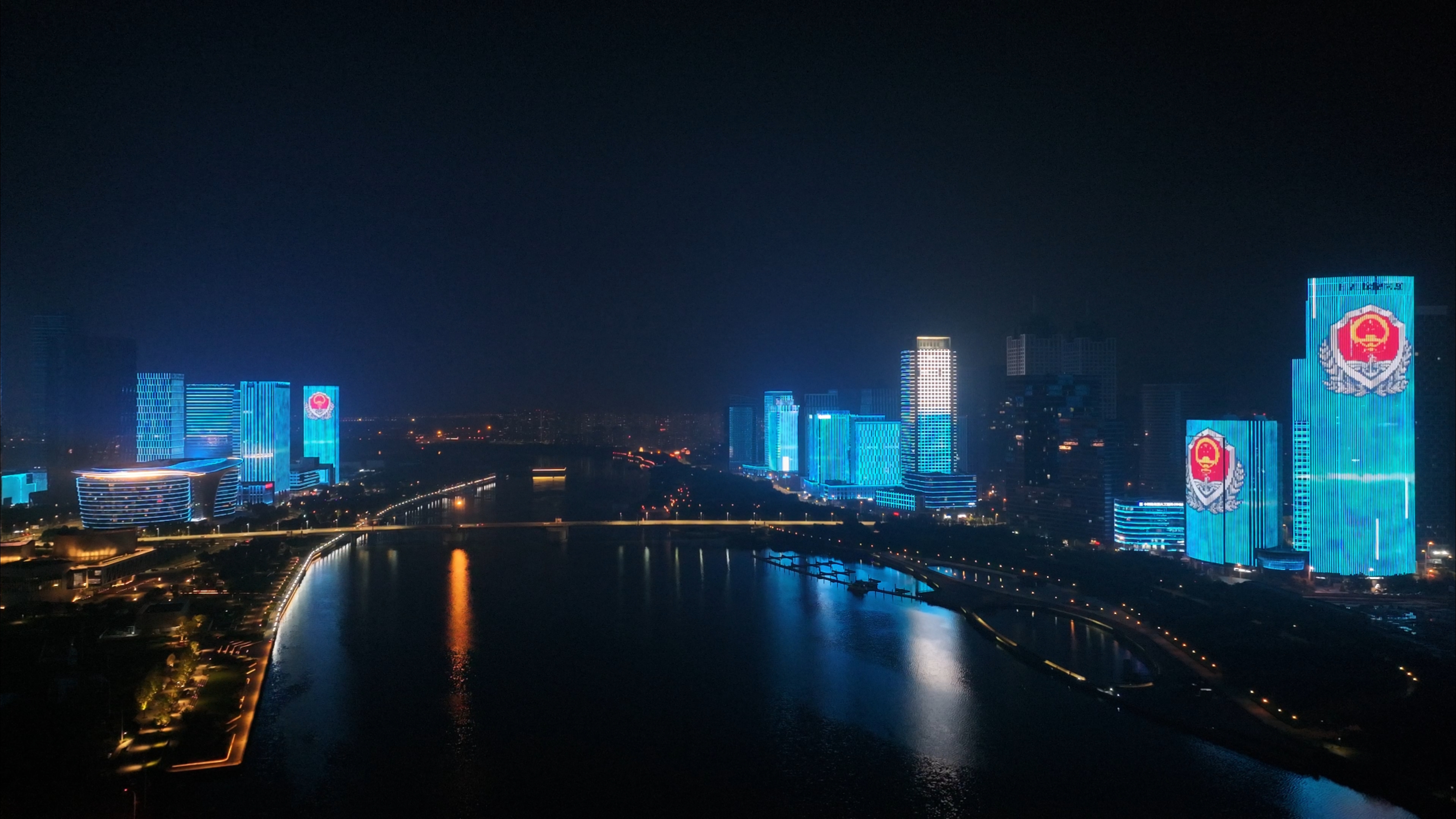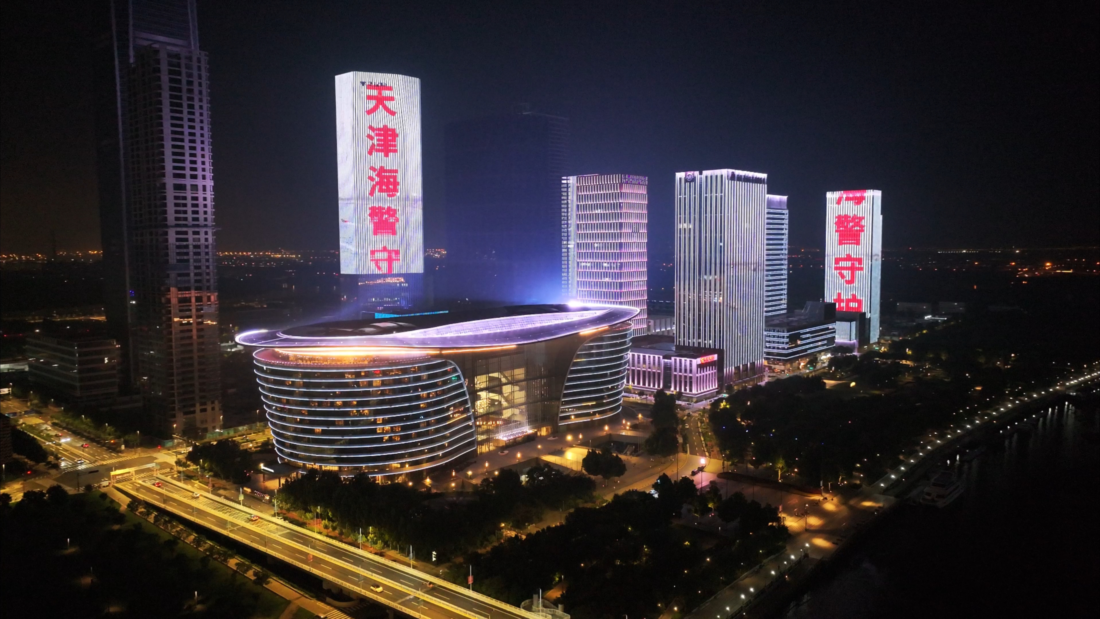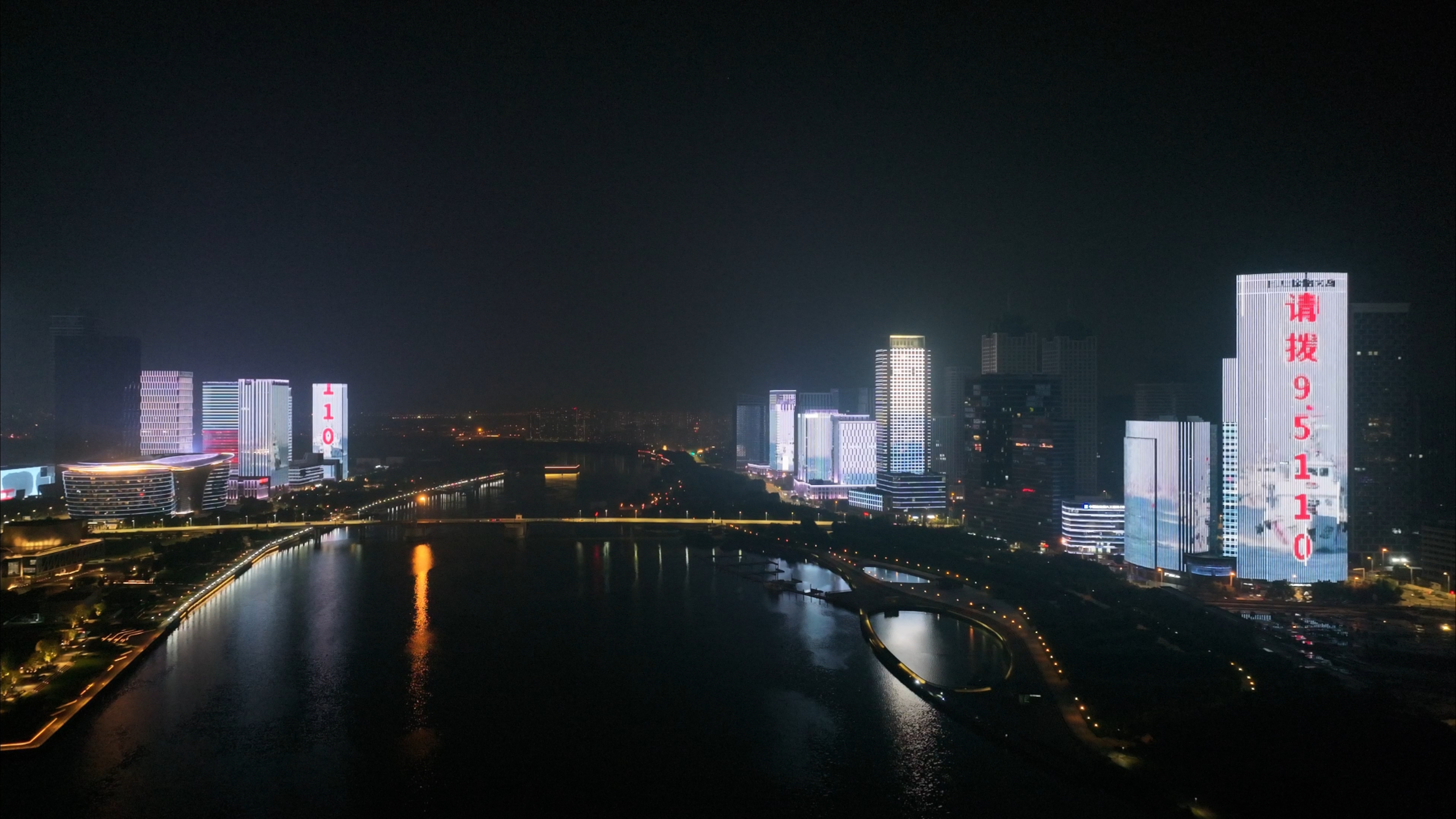 夜渐深,灯光秀进入高潮。地标建筑群同步亮起“海上有警情、请拨95110”“天津海警守护海上安宁”等动态标语,与海河沿岸众多楼宇LED灯带交相辉映。
