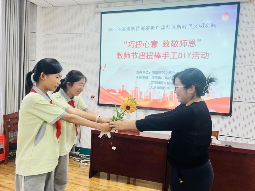 津滨网讯(记者 李婷婷 通讯员 纪胜男 朱会滨 摄影报道)9月10日,海滨街道公共服务办公室、海滨街道社会组织联合会、合协社会工作服务中心、广场社区联合大港油田第四中学共同开展了以“巧扭心意 致敬师恩”为主题的扭扭棒手工DIY活动。学生们以亲手制作的创意作品,向恩师传递了一份独特而温暖的节日祝福,进一步弘扬尊师重教的传统美德。