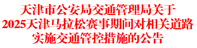 (二)2025年10月26日7时10分起,友谊北路、马场道(围堤道至新华路)、河北路(马场道至南京路)、西康路(马场道至贵州路)、贵州路(吴家窑大街至成都道)、成都道(贵州路至南京路)、云南路(成都道至重庆道)、重庆道(云南路至河北路)禁止一切车辆通行(持有2025天津马拉松比赛专用证件的车辆除外)。过往社会车辆可绕行卫津路、气象台路、西康路(成都道以北)、贵州路(岳阳道以北)、营口道、永安道、大沽南路、利民道、围堤道等道路。