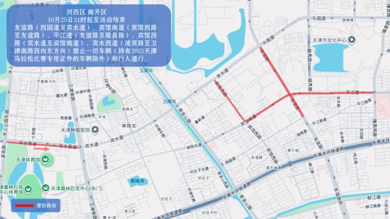 (一)2025年10月25日21时起,友谊路(西园道至宾水道)、宾馆南道(宾馆西路至友谊路)、平江道(友谊路至隆昌路)、宾馆西路(宾水道至宾馆南道)、宾水西道(凌宾路至卫津南路西向东方向)、北十五经路(海河东路至六纬路)禁止一切车辆(持有2025天津马拉松比赛专用证件的车辆除外)和行人通行。过往社会车辆可绕行紫金山路、气象台路、黑牛城道、广东路、乐园道、尖山路、隆昌路、卫津南路等道路。
