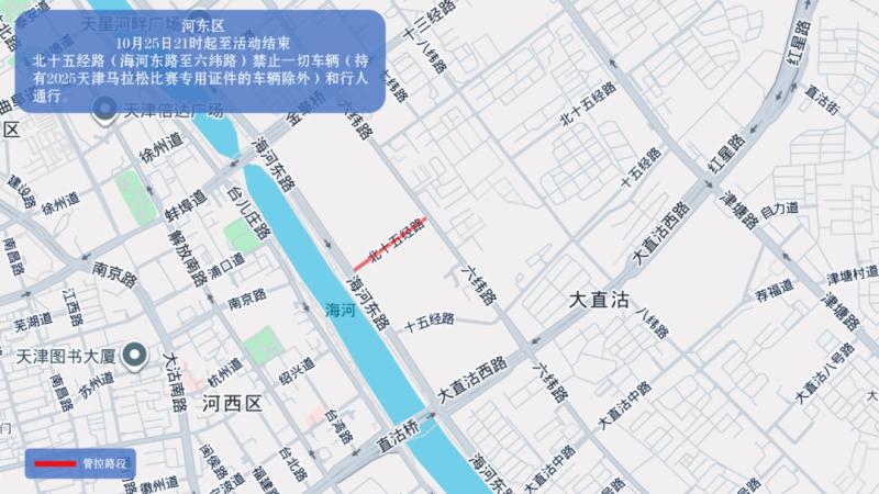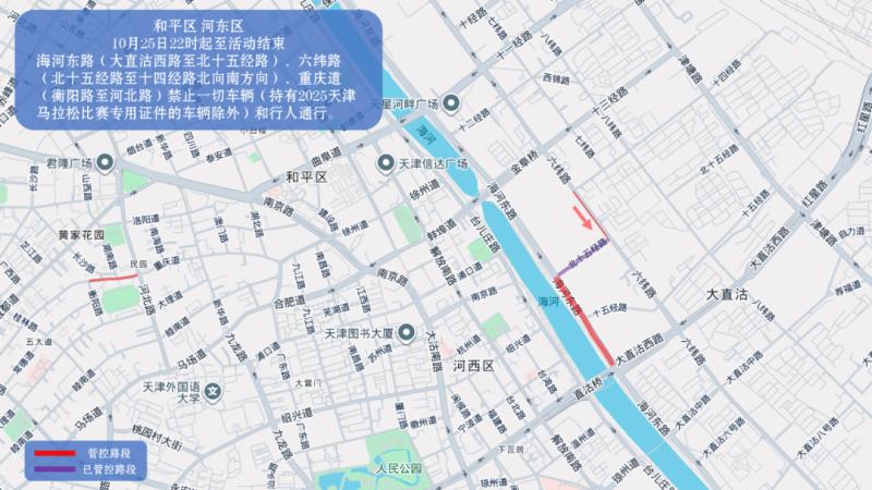 (二)2025年10月25日22时起,海河东路(大直沽西路至北十五经路)、六纬路(北十五经路至十四经路北向南方向)、重庆道(衡阳路至河北路)禁止一切车辆(持有2025天津马拉松比赛专用证件的车辆除外)和行人通行。过往社会车辆可绕行六纬路、十四经路等道路。