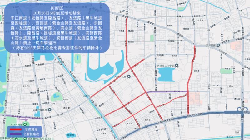 (一)2025年10月26日5时起,平江南道(友谊路至隆昌路)、友谊路(黑牛城道至围堤道)、西园道(紫金山路至友谊路)、乐园道(友谊路至黄埔南路)、宾水道(紫金山路至友谊路)、隆昌路(围堤道至黑牛城道)、宾馆西路(宾水道至黑牛城道)、宾馆南道(友谊路至紫金山路)禁止一切车辆通行(持有2025天津马拉松比赛专用证件的车辆除外)。过往社会车辆可绕行广东路、紫金山路、气象台路、黑牛城道、尖山路、解放南路、大沽南路等道路。