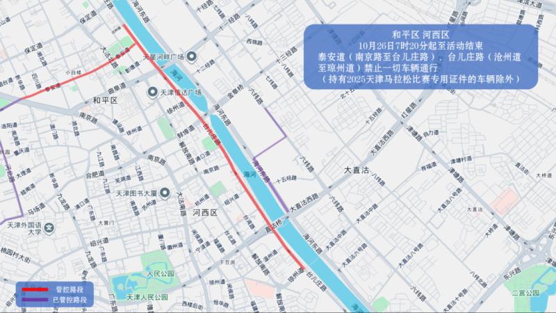 (三)2025年10月26日7时20分起,泰安道(南京路至台儿庄路)、台儿庄路(沧州道至琼州道)禁止一切车辆通行(持有2025天津马拉松比赛专用证件的车辆除外)。过往社会车辆可绕行新华路、南京路(山西路以西、湖北路以东)、解放南路、大沽南路等道路。