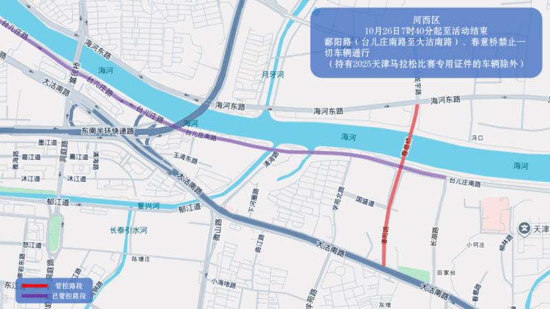 (五)2025年10月26日7时40分起,鄱阳路(台儿庄南路至大沽南路)、春意桥禁止一切车辆通行(持有2025天津马拉松比赛专用证件的车辆除外)。过往社会车辆可绕行大沽南路、海河东路(雪莲南路以东)、吉兆桥等道路。