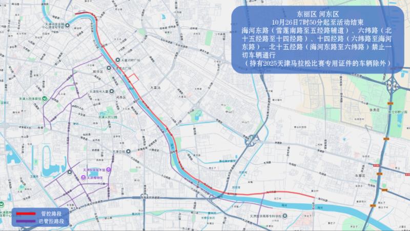 (六)2025年10月26日7时50分起,海河东路(雪莲南路至五经路辅道)、六纬路(北十五经路至十四经路)、十四经路(六纬路至海河东路)、北十五经路(海河东路至六纬路)禁止一切车辆通行(持有2025天津马拉松比赛专用证件的车辆除外)。过往社会车辆可绕行先锋路、津塘路、大沽南路、环宇道、富民路、光华路、六纬路、八纬路、十一经路立交桥等道路。