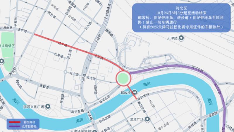 (七)2025年10月26日8时05分起,解放桥、世纪钟环岛、进步道(世纪钟环岛至胜利路)禁止一切车辆通行(持有2025天津马拉松比赛专用证件的车辆除外)。过往社会车辆可绕行博爱道、北安桥、大沽桥等道路。