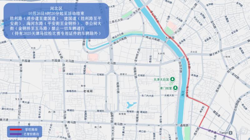(八)2025年10月26日8时20分起,胜利路(进步道至建国道)、建国道(胜利路至平安街)、海河东路(平安街至金钢桥)、李公祠大街(金钢桥至五马路)禁止一切车辆通行(持有2025天津马拉松比赛专用证件的车辆除外)。过往社会车辆可绕行博爱道、民生路、平安街、金纬路、翔纬路、狮子林大街、中山路、黄纬路等道路。