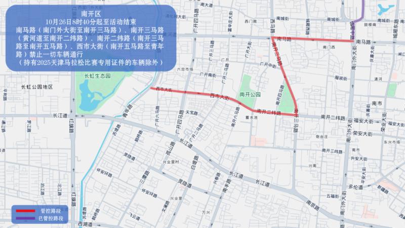 (十)2025年10月26日8时40分起,南马路(南门外大街至南开三马路)、南开三马路(黄河道至南开二纬路)、南开二纬路(南开三马路至南开五马路)、西市大街(南开五马路至青年路)禁止一切车辆通行(持有2025天津马拉松比赛专用证件的车辆除外)。过往社会车辆可绕行西马路、城厢西路、黄河道、南开三马路等道路。
