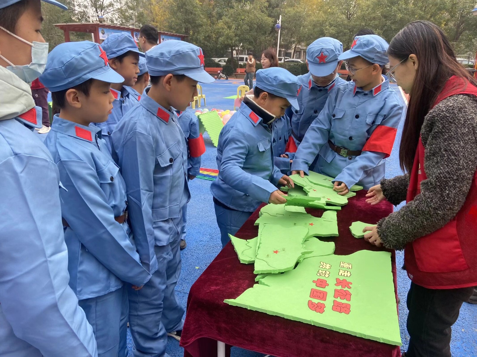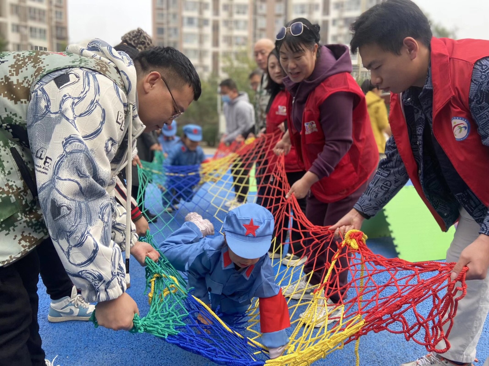 每个关卡都对应着红军长征的重要历史节点,如“突破封锁线”关卡对应“突破湘江封锁线”,比赛场地拉着3条彩色绳代表“封锁线”,每组队员需匍匐或弯腰依次穿过,过程中不能碰绳。“本关卡意义在于体验红军突破敌人封锁的不易,培养灵活应变能力。”社区工作人员介绍,“我们通过将‘不怕任何艰难险阻’的长征精神与强健体魄的运动项目有机融合,引导中心少年儿童在体育项目中践行长征精神,厚植爱国主义情怀,树立‘强国有我’的远大理想。同时鼓励青少年要铭记历史,不忘初心,继续前进,把长征精神转化为学习和工作的动力,奋力走好新时代长征路。”