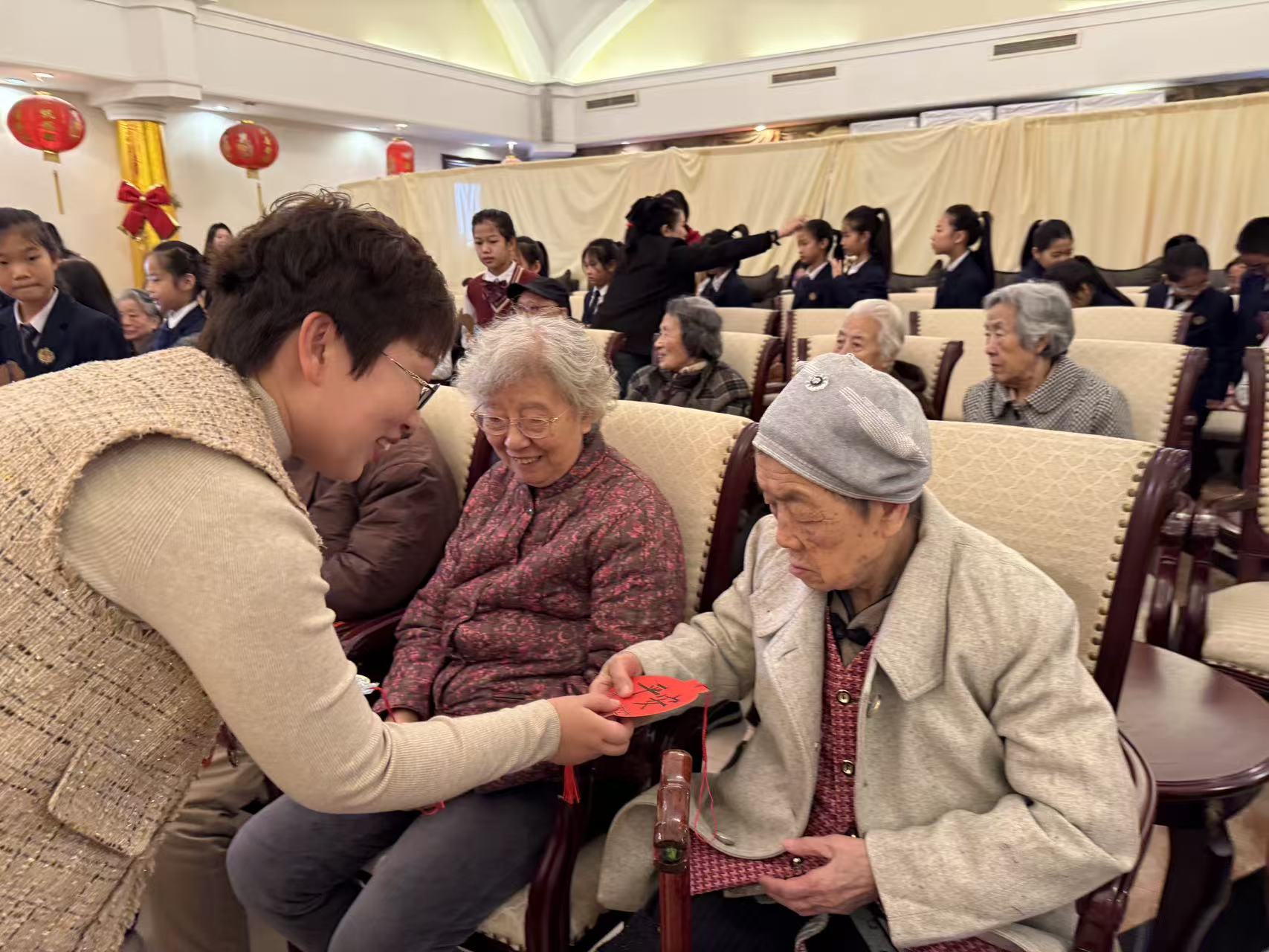 浙江路小学少先队员代表带来的小合唱《如愿》,用纯净的歌声,向为今天幸福生活奋斗一生的祖辈们,表达了最深切的感恩之情。歌声落幕后,温馨的互动环节随即展开。集团校向阳一小的党员代表和学生代表将他们亲手制作的平安香囊赠送到每一位爷爷奶奶手中,小小的香囊承载着孩子们祈愿长辈健康平安的美好祝福。