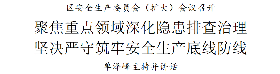 会议强调,各单位、各部门要狠抓安全生产责任落实,进一步压紧压实属地管理责任、部门监管责任、企事业单位主体责任和员工个人责任,保持“时时放心不下”的责任感和如履薄冰、如临深渊的危机感,以坚定的态度、有力的举措、迅速的行动,坚决克服松懈思想和侥幸心理,在真重视、真得法、真管住上下足功夫,坚决严守筑牢安全生产底线防线,为推动全区经济社会高质量发展提供坚实的安全保障。