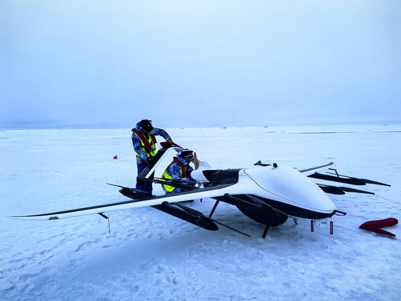 记者了解到,为全面验证无人机性能,飞马技术团队设计了分层递进的系统性测试。航次初期,在日本海、阿拉斯加海域,团队率先开展了甲板推油测试与模拟飞行演练,模拟并验证了设备在海上高湿环境下的适配性与操作稳定性。进入北极核心作业区后,团队进一步挑战极限,先后成功完成了V1的长航时续航测试、大载重起降测试,以及与“中山大学极地”号科考船协同的船载起降飞行任务。这一系列高强度测试,精准验证了V1在极寒、复杂地貌下的续航韧性、载重实力及船载作业兼容性。