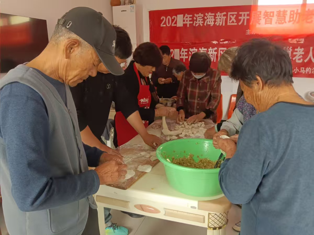 与此同时,小马杓沽村日间照料中心里却是另一番热闹景象——揉面、擀皮、包馅、捏合,一场热闹非凡的包饺子活动正在火热进行。照料中心的工作人员提前准备好新鲜的面团、饱满的馅料,村民们闻讯而来,大家围坐在一起,分工协作、各展身手。有经验的阿姨们手法娴熟,指尖翻飞间,一个个造型规整的饺子便摆满了托盘;大家一边包饺子,一边拉着家常,聊聊收成、说说近况,欢声笑语不断,小小的活动室里暖意融融。