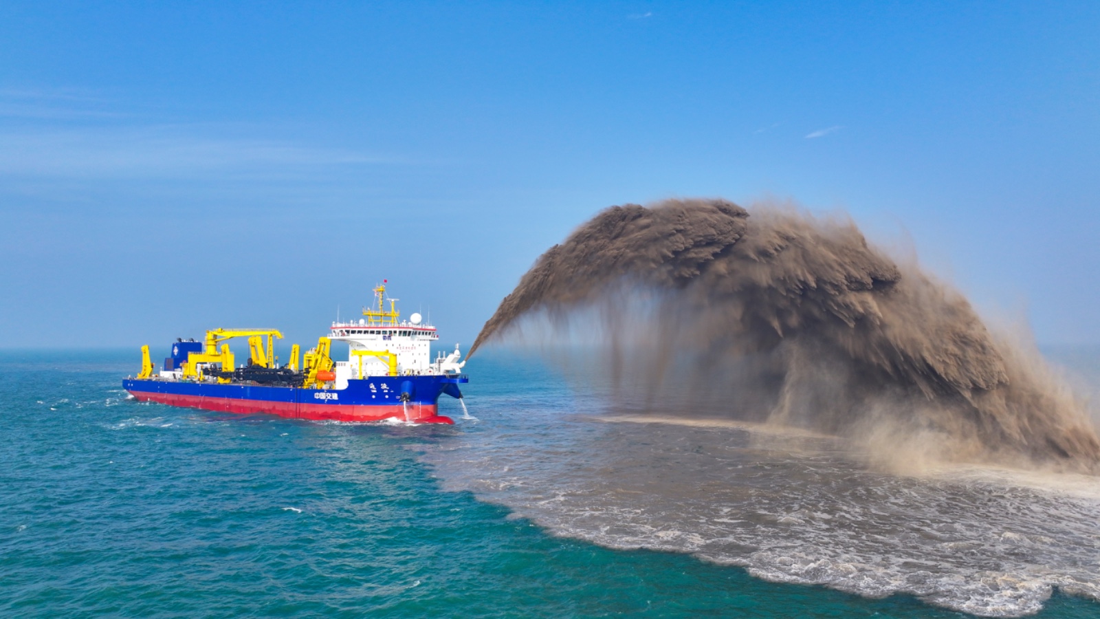 “通浚”轮是我国首艘自主设计建造的35000立方米舱容等级超大型耙吸挖泥船,最大舱容达38168立方米,位列亚洲第一、世界第二。海试期间,该船搭载的两台9000千瓦舱内泥泵展现出强劲性能,可实现12公里超远排距作业,单船一次疏浚量可将标准足球场填高5米,充分印证了其“强破土、远运距、长吹距”的优异性能。