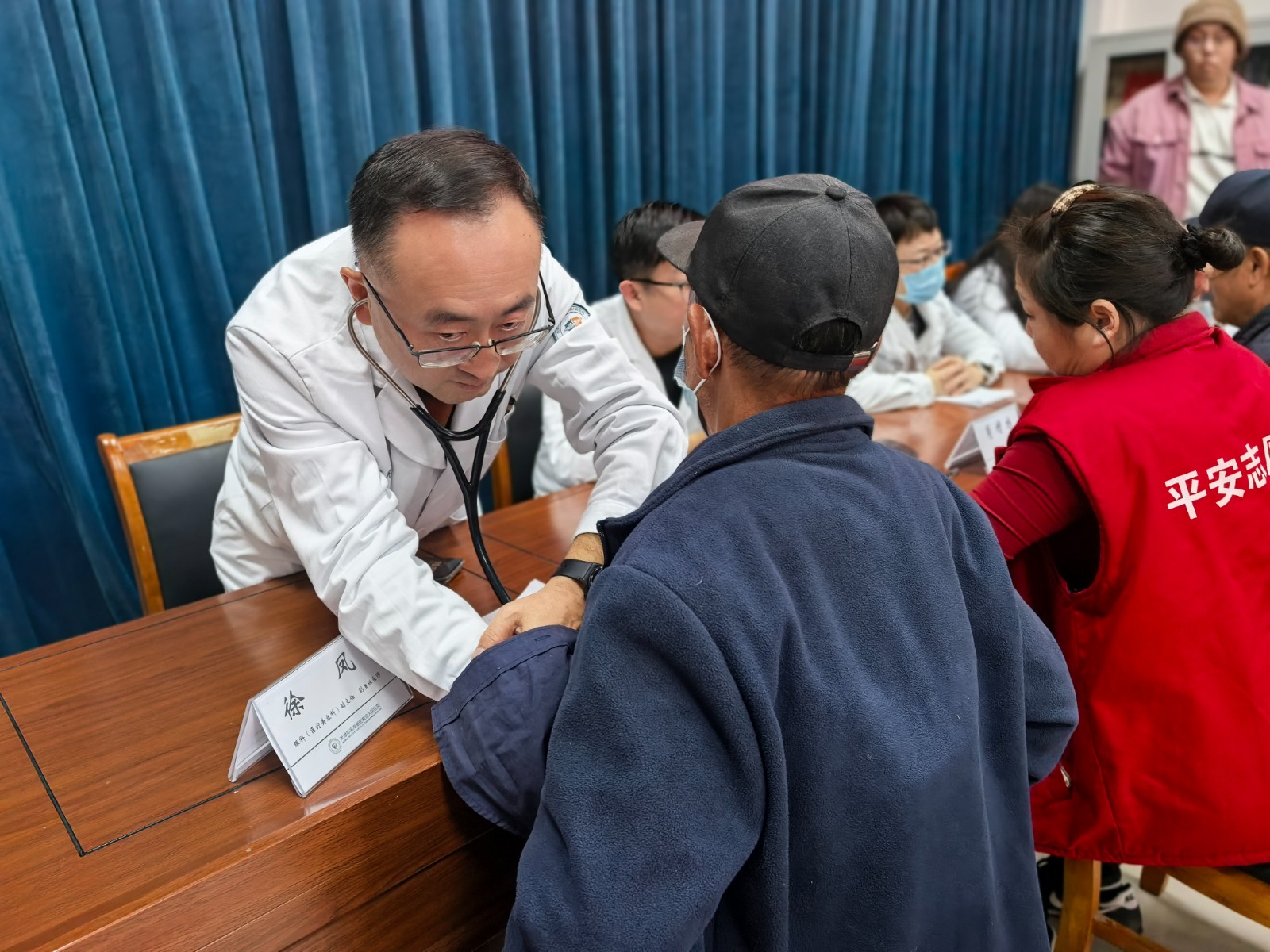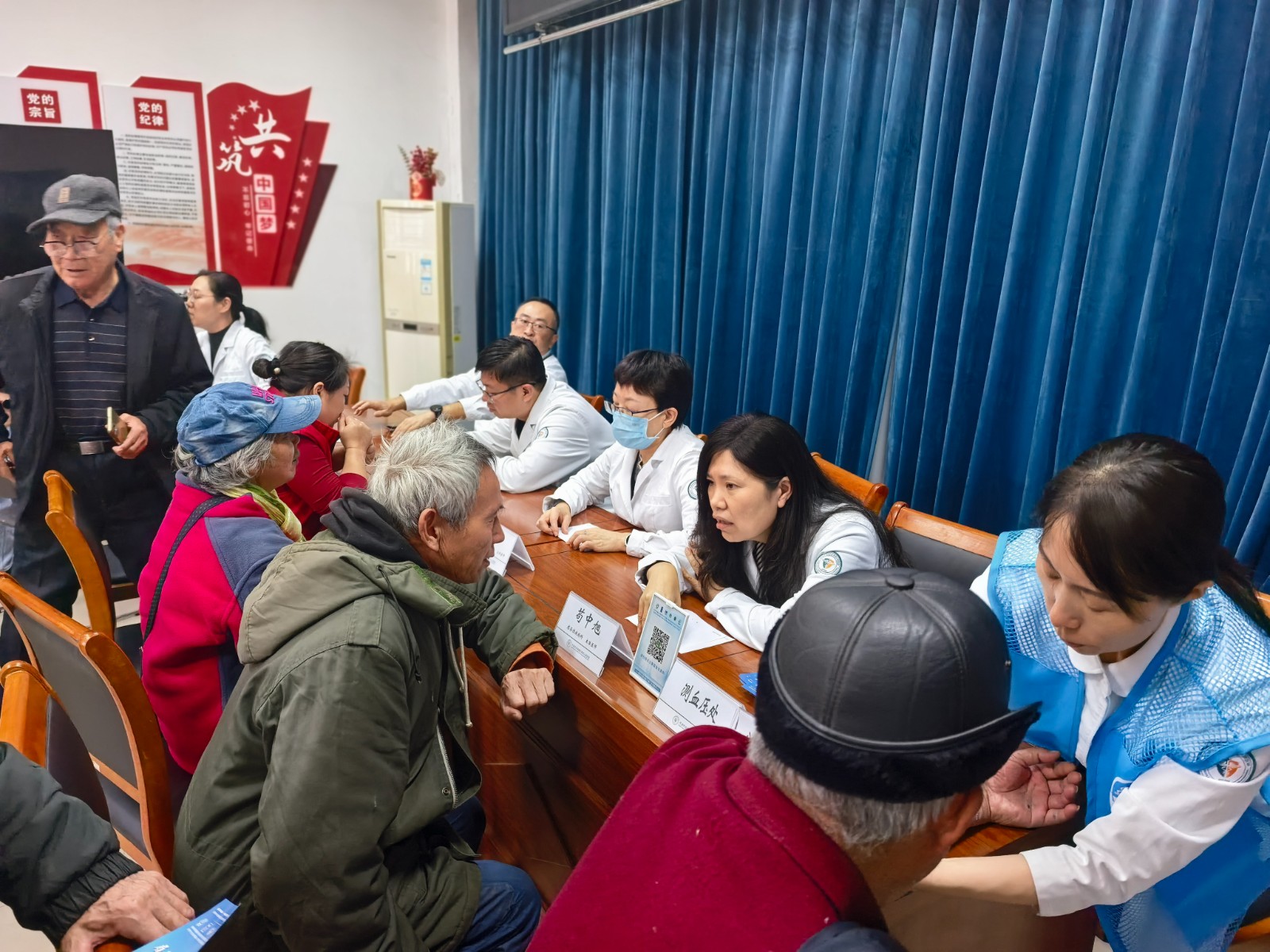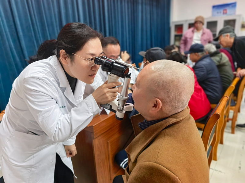 宣讲结束后,义诊活动随即展开。结合老年人常见病,医院精心安排了内分泌代谢病科、中医科、感染性疾病科、眼科等专家现场坐诊,为居民提供个性化的健康生活和用药指导。针对最近流感高发的情况,许承斌耐心询问每位居民的呼吸道健康状况,细致讲解秋冬季节流感的防治要点。在眼科检查区,医生用专业设备为居民进行眼底筛查,并不时叮嘱日常护眼注意事项。护理人员为老人们测量血压并发放健康宣传手册。