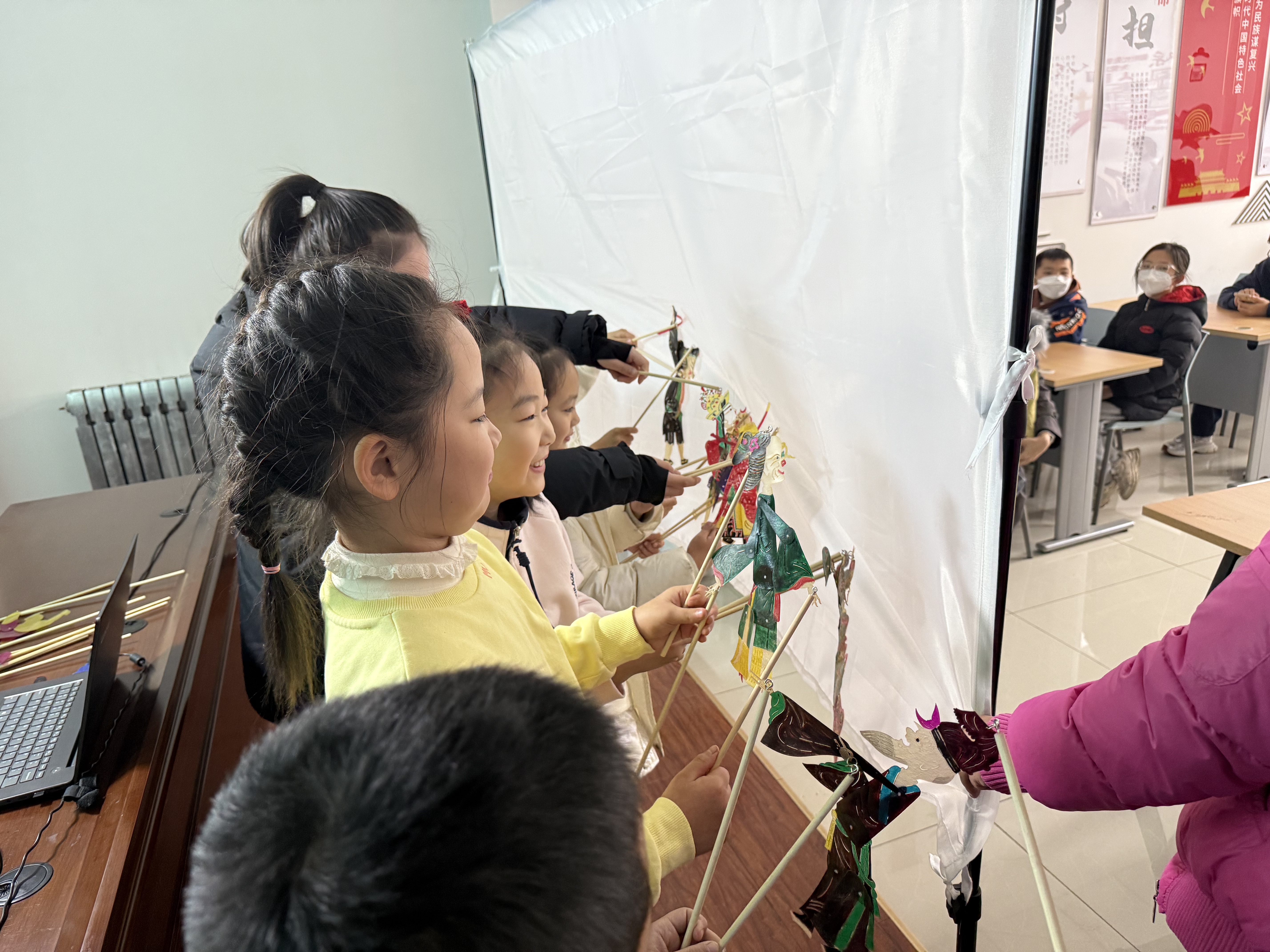 随后的皮影戏表演环节,经典故事《三打白骨精》《小猫钓鱼》依次“开演”:孩子们分成小组,有人负责操控皮影的肢体动作,有人配合剧情配音,有人在幕布旁调整灯光角度。当“孙悟空”的金箍棒在幕布上“挥动”,台下传来阵阵欢呼;“小猫”抓鱼的憨态动作,也让小观众们笑作一团——幕布前后的协作,让原本单一的“手工+表演”,变成了一场充满默契的集体创作。