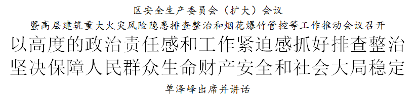 津滨网讯(记者 杨静如)12月18日,区安全生产委员会(扩大)会议暨高层建筑重大火灾风险隐患排查整治和烟花爆竹管控等工作推动会议召开,深入学习贯彻习近平总书记关于安全生产的重要论述和关于消防工作的重要指示批示精神,按照国务院安委会和市委、市政府部署要求,以高度的政治责任感和工作紧迫感,全力抓好重大火灾风险隐患排查整治和烟花爆竹管控工作,坚决保障人民群众生命财产安全和社会大局稳定。区委副书记、区长单泽峰出席会议并讲话,区委常委、副区长罗平主持会议,副区长杨玉建、陈华荣出席。