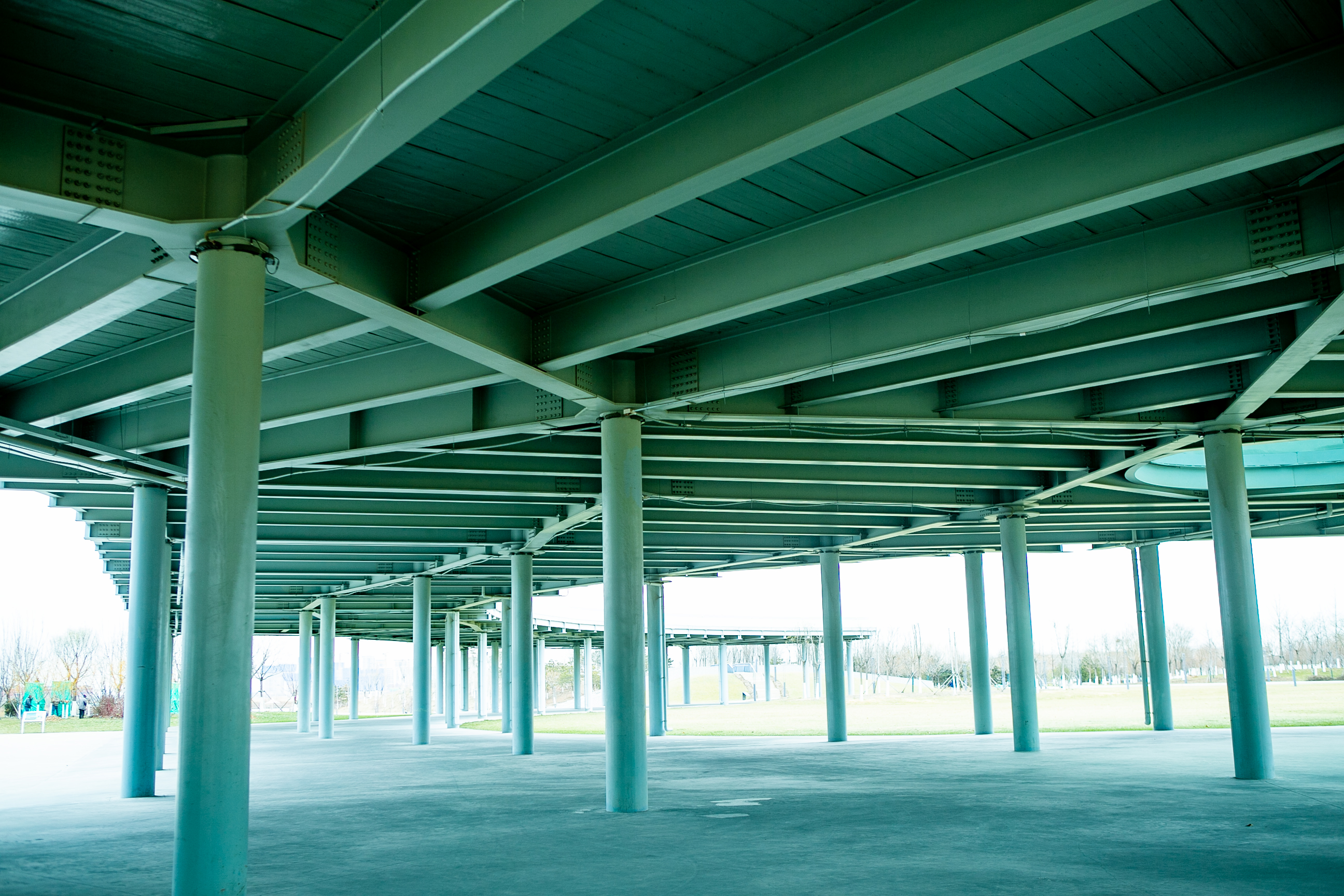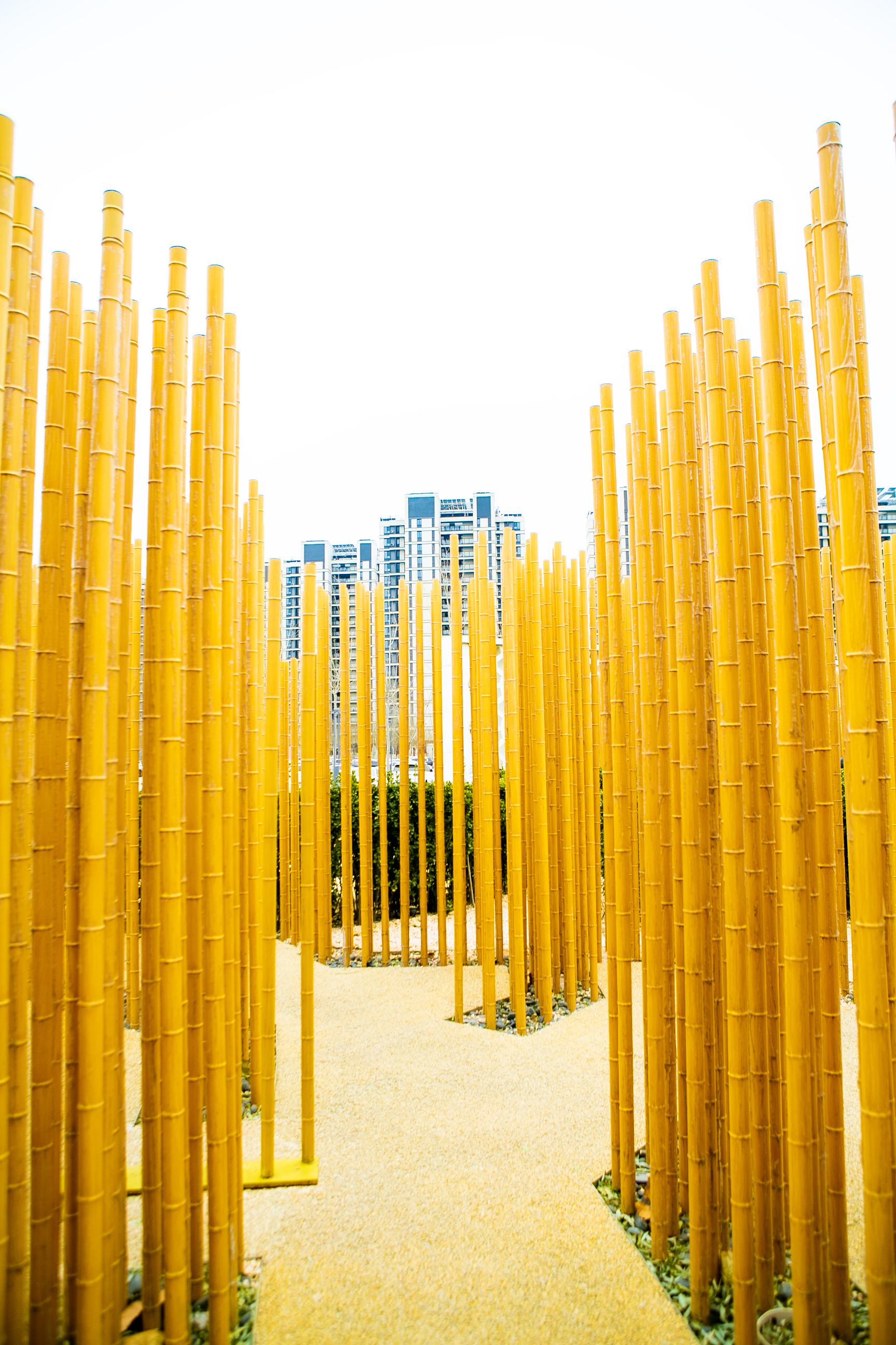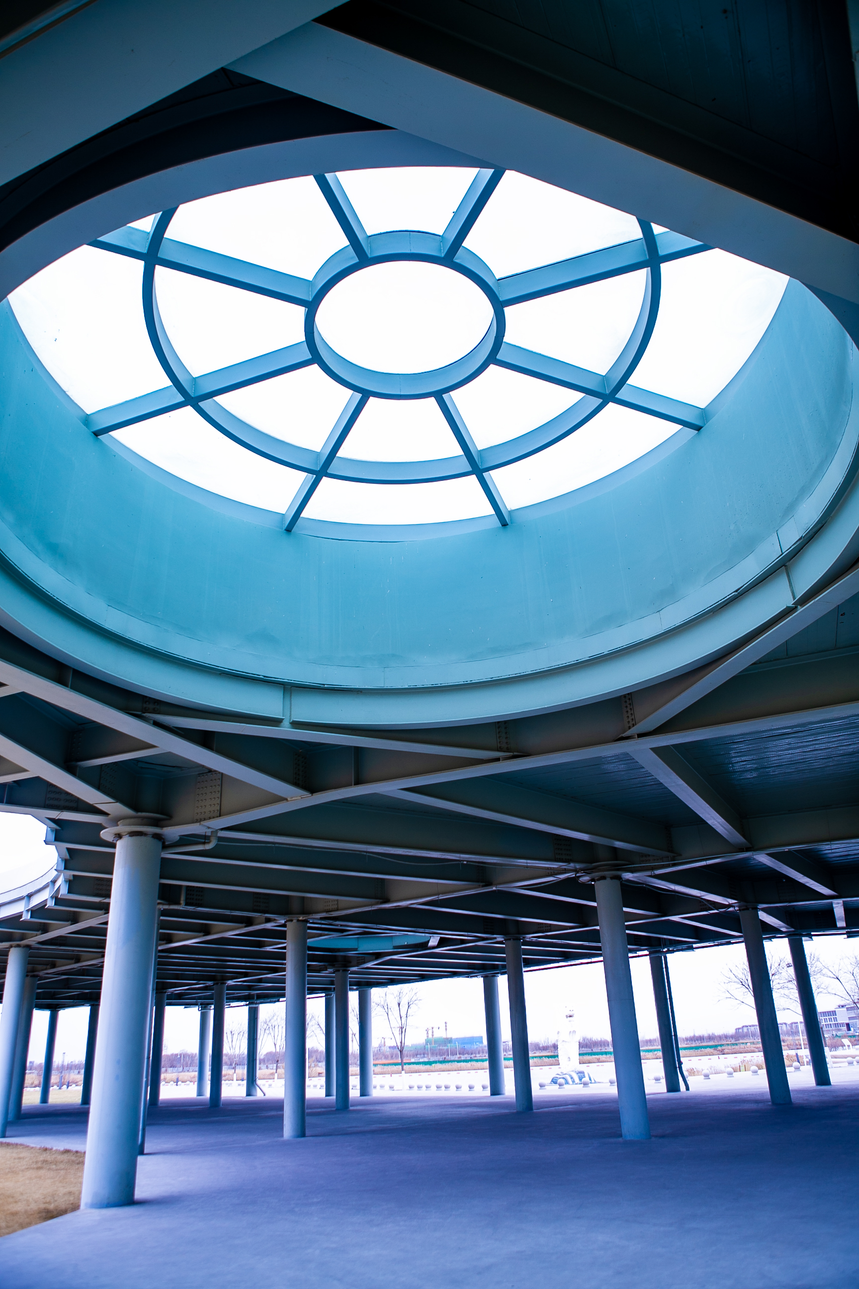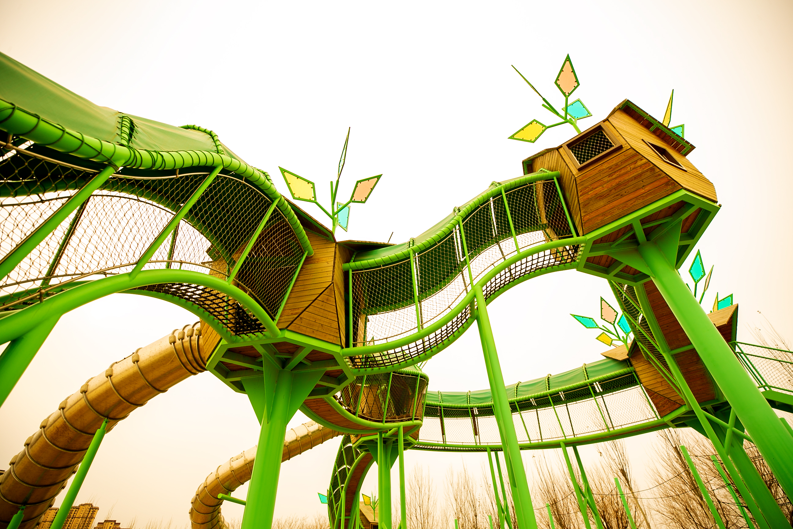 你会撞见彩虹色的起伏地垫托着滑梯,金属支架撑起的绿廊像攀向云端的藤蔓;也会步入金黄竹阵的迷宫,看几何切面的淡蓝墙体漏进细碎天光。桥体下的柱廊是建筑的韵律诗,穹顶天窗又把天空裁成温柔的圆——连冬日的树枝,都在暖色调滤镜里成了画框的线条。