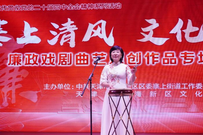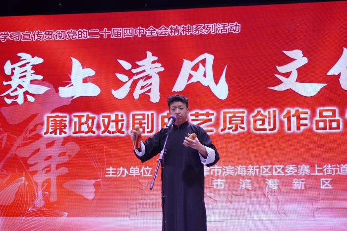 演出现场,寨上街道平阳里社区率先带来小品《纪在心头 反诈防骗》,以诙谐生动的表演,提醒群众严守纪律底线、筑牢防骗防线;滨海新区文化馆曲艺干部表演的快板《糊涂县官》,在欢声笑语中传递为官需清醒务实的深刻道理;评剧清唱《廉韵清风满小巷》选段,以字正腔圆、韵味醇厚的表演,将廉韵融入传统唱腔,赢得满堂喝彩,将廉洁清风送入人心;在器乐书画展示环节,古筝、二胡协奏与现场书画创作相得益彰,在琴韵墨香中诠释廉洁文化的高远意境;京东大鼓《一面镜子》,以“镜”为喻,映照初心使命与行为得失;评剧清唱《焦裕禄》选段,深情缅怀人民公仆,传递鞠躬尽瘁、廉洁奉公的崇高情怀;压轴登场的评剧小戏《一句话的事》,引发观众对廉洁修身、严于律己的深刻思考。