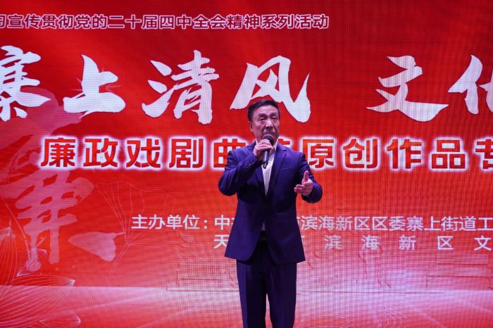 津滨网讯(记者 周华婷 张鹏 刘芸 实习生 李兰馨)12月19日,学习宣传贯彻党的二十届四中全会精神系列活动——“寨上清风 文化润廉”廉政戏剧曲艺原创作品专场演出在滨海新区文化馆汉沽馆区剧场举行。社区居民齐聚一堂,共赴这场以艺传廉、以文化人的廉洁盛宴。